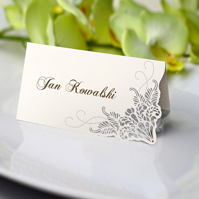 Winietka na stół z najnowszej kolekcji wykonana z matowego papieru w kolorze ecru. Delikatny ozdobny wzór na dole winietki wycięty techniką laserową. Nadruk nazwisk bezpośrednio na winietce