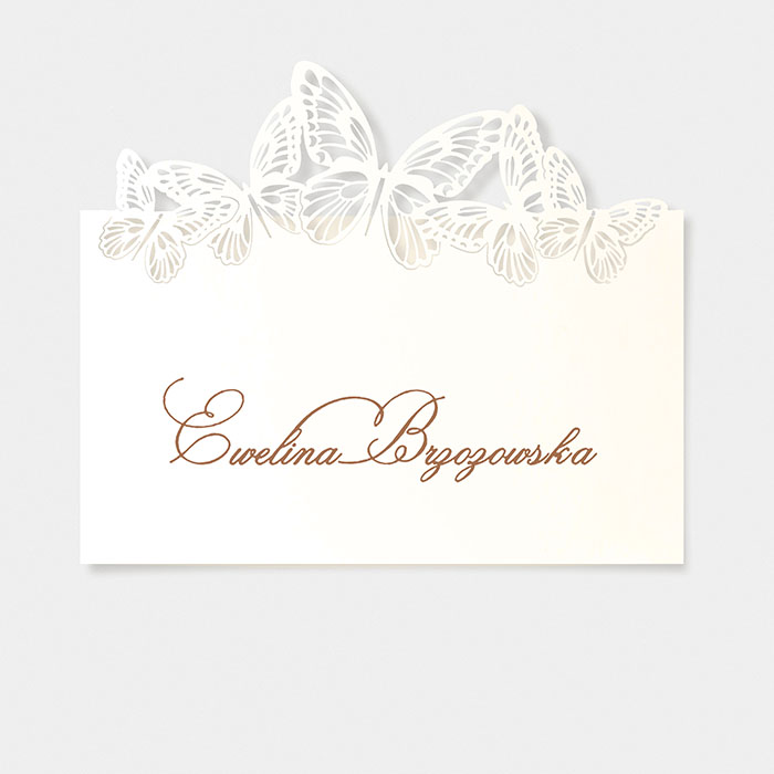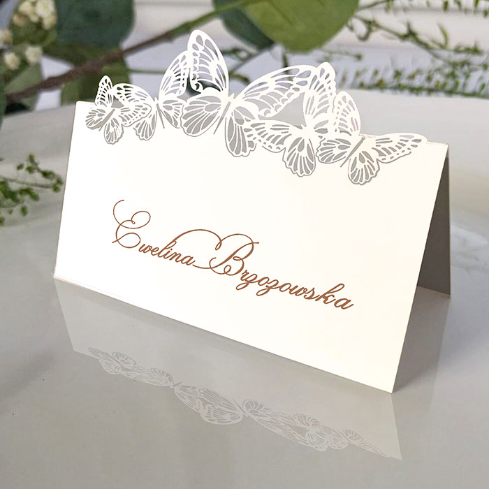 Winietka na stół z najnowszej kolekcji wykonana z matowego papieru w kolorze ecru. Winietka wycięta techniką laserową. Nadruk nazwisk bezpośrednio na winietce