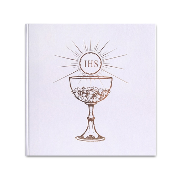 Księga Gości Komunijnych – 20,5 x 20,5 cm, 25 kartek. Księga z białego, ozdobnego papieru ze złotym kielichem. Księga posiada dwie pierwsze strony nadrukowane (pierwsza do wpisania danych, druga do wklejenia zdjęcia).