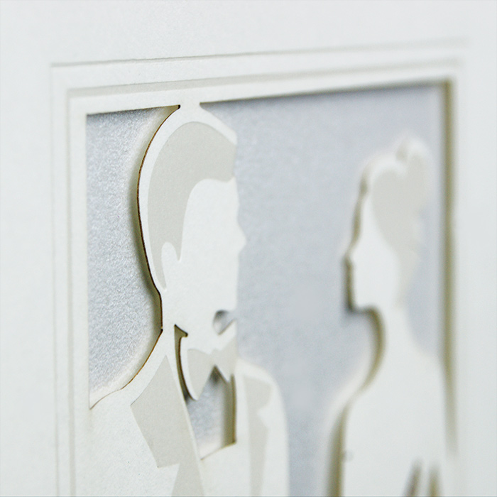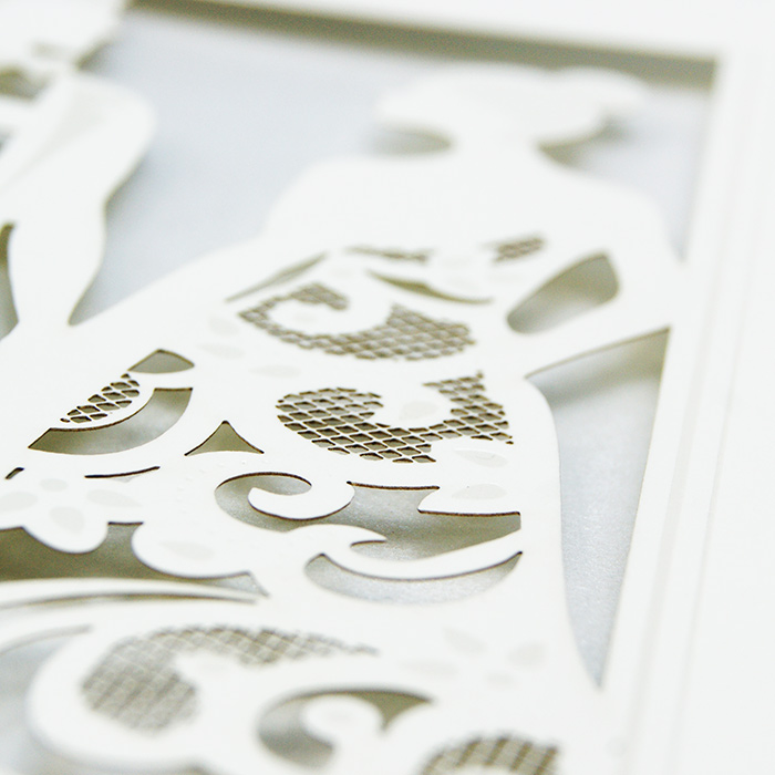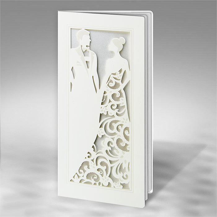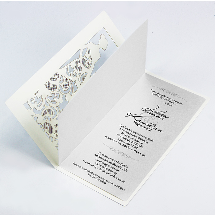 Zaproszenie z najnowszej kolekcji, wykonane z wysokiej jakości matowego papieru w kolorze ecru. Okładkę ozdabia motyw Młodej Pary wykonany techniką cięcia laserowego i hotstampingu. Wkładka do nadruku tekstu metalizowana w kolorze perłowym, dająca delikatne tło wycięciu laserowemu. Zaproszenie wysyłamy w formie gotowej do wręczenia. Zaproszenie wykonane z ogromną starannością i dbałością o detale. Precyzyjny nadruk, dokładność wykonania oraz wysokiej jakości papier. Do zaproszenia dodana jest ozdobna koperta (130g/m2) GRATIS.