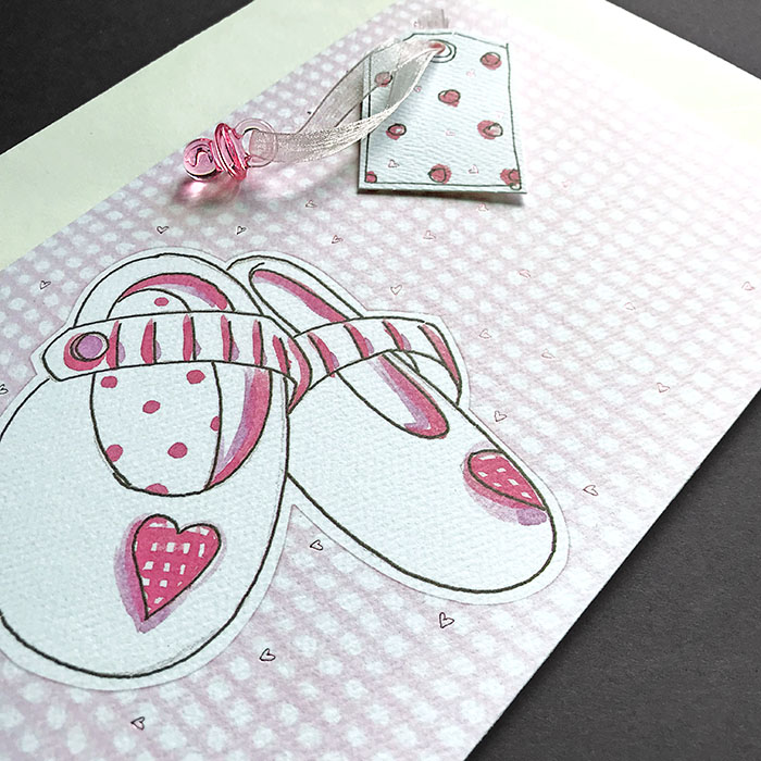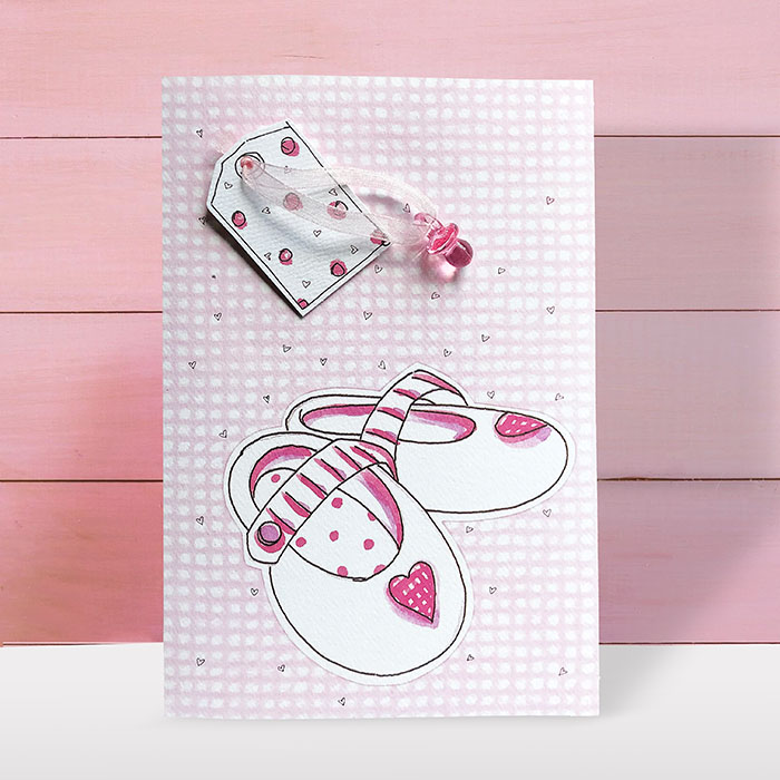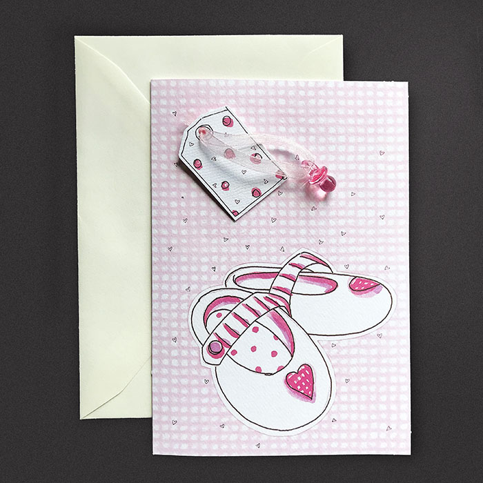 Zaproszenie na chrzest, wykonane z wysokiej jakości matowego, fakturowanego papieru. Na okładce znajduje się ilustracja różowych bucików. Uroku dodaje przywiązany do okładki różowy smoczek. Nadruk tekstu wykonany na matowej wkładce w kolorze różowym. Kartki wysyłamy w formie gotowej do wręczenia. Wykonane są z ogromną starannością i dbałością o detale. Precyzyjny nadruk, dokładność wykonania oraz wysokiej jakości papier. KOPERTA: Do karty dodawana jest gratis ozdobna koperta o gramaturze 120 g/m2.