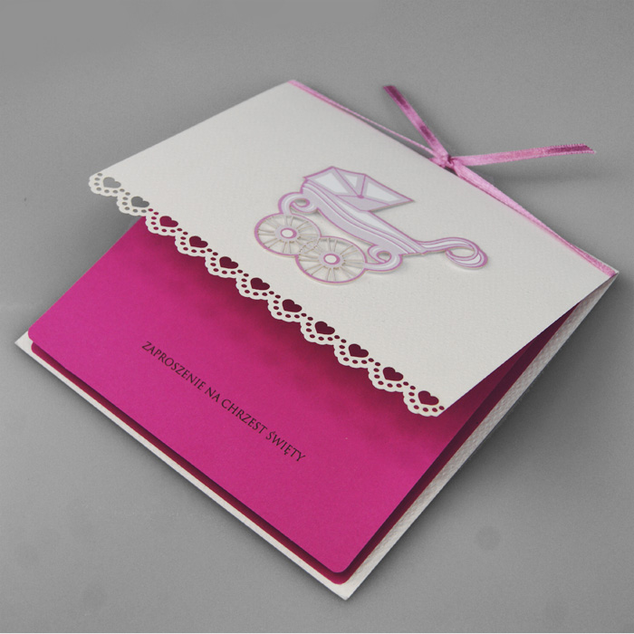 Zaproszenie składa się ze sztywnej kartki, zadrukowanej jednostronnie. Zaproszenie wysyłamy w formie gotowej do wręczenia. Zaproszenie wykonane z ogromną starannością i dbałością o detale. Precyzyjny nadruk, dokładność wykonania oraz wysokiej jakości papier. Minimalna ilość zamówienia tego wzoru to 15szt.