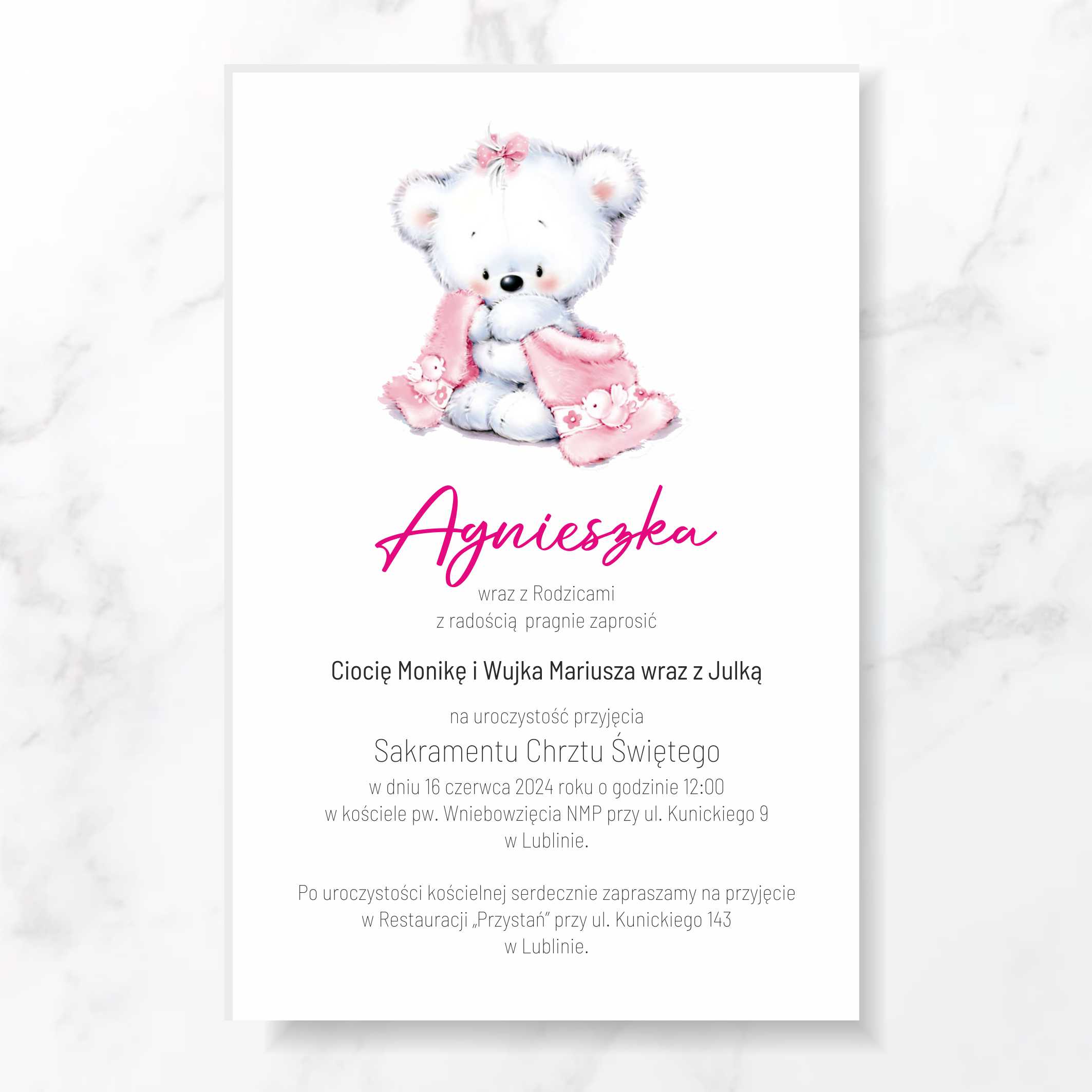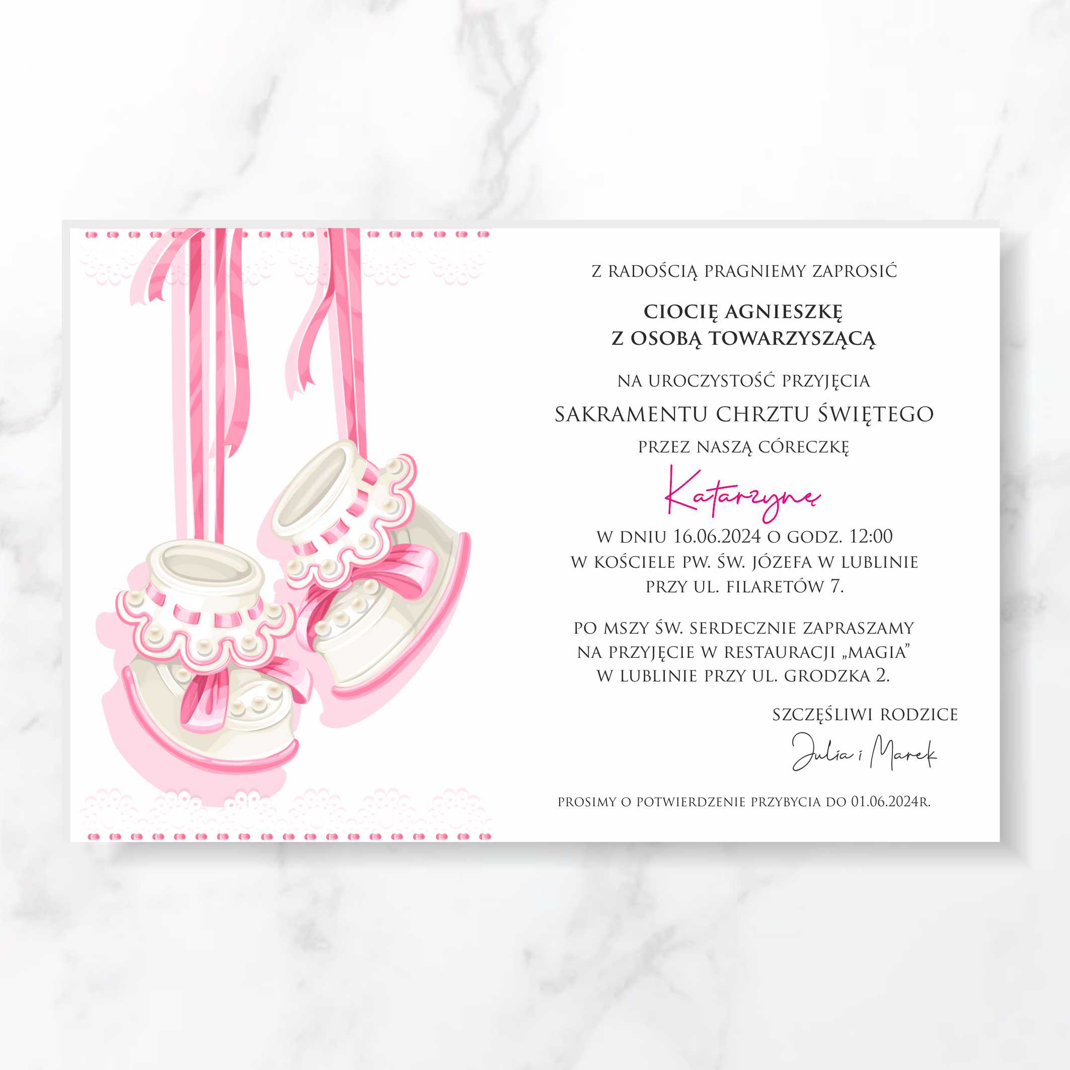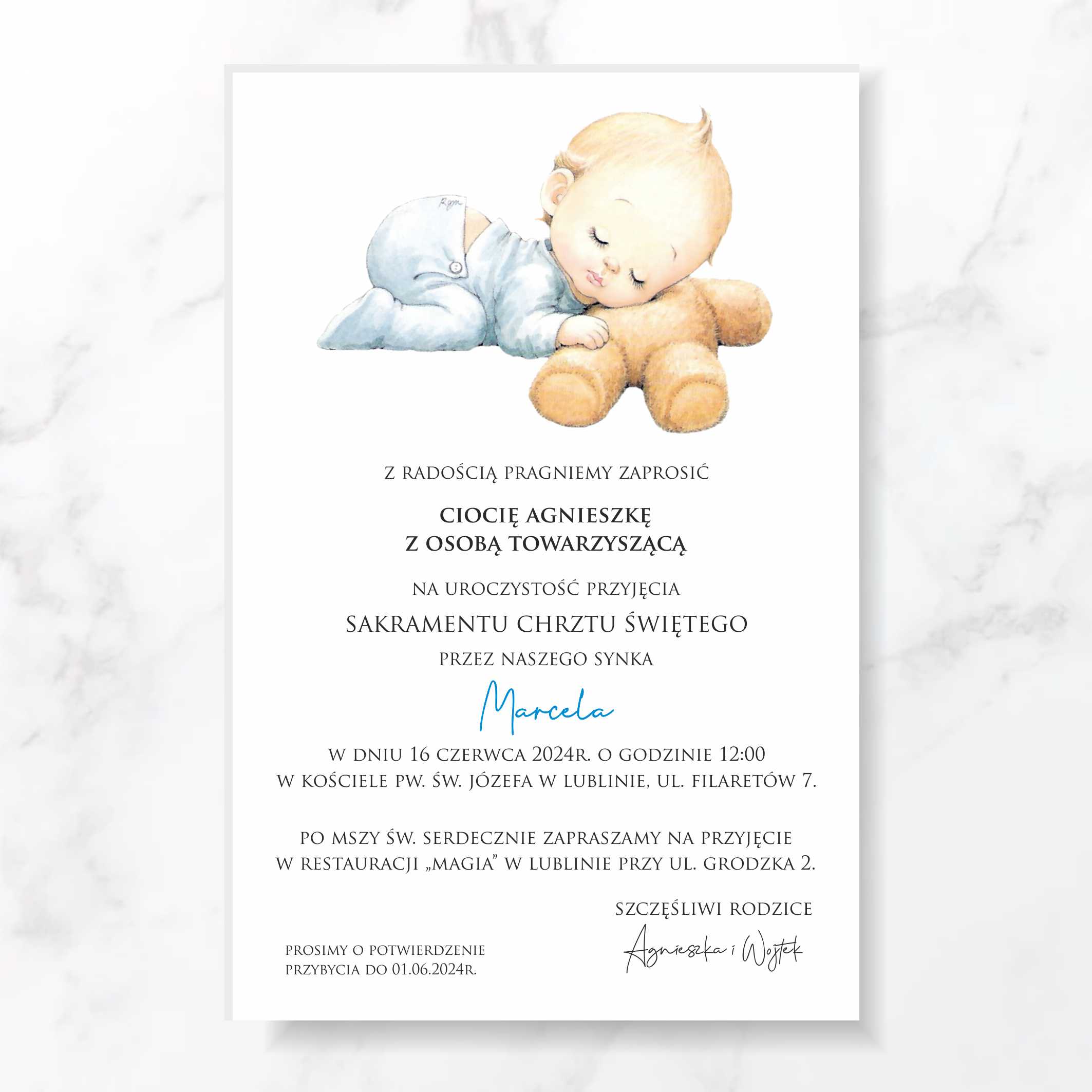 *na zaproszeniu został przedstawiony przykładowy wybór czcionek oraz ułożenia tekstów – istnieje możliwość zmiany