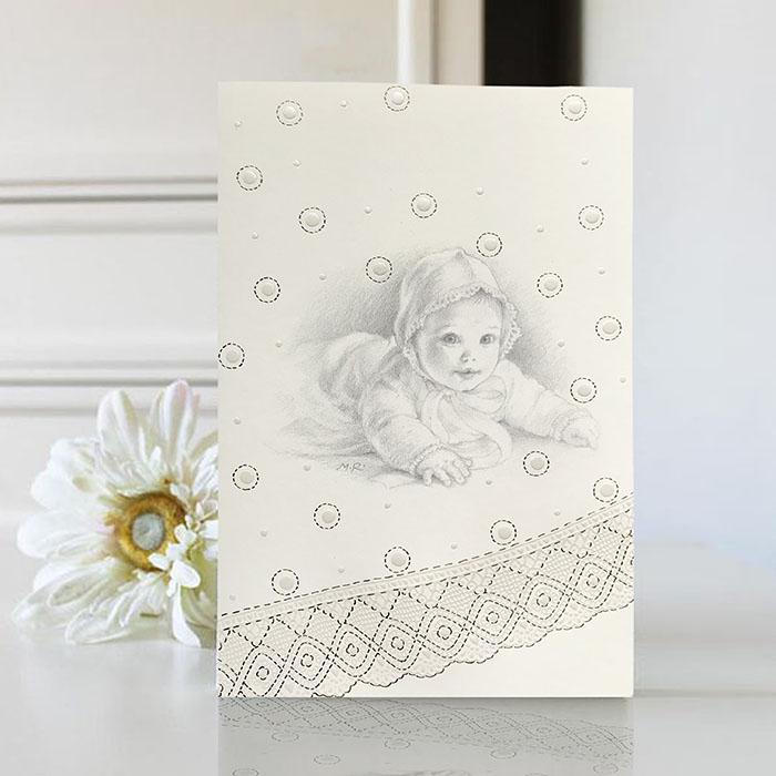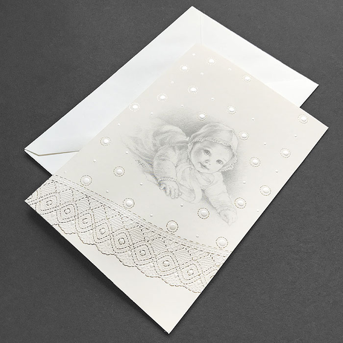 Wyjątkowe zaproszenie na chrzest wykonane z wysokiej jakości papieru w kolorze kremowym. Na okładce nadrukowany szkic dziecka, pozostałe elementy zostały wykonane metodą tłoczenia i złocenia. Nadruk bezpośrednio na okładce. Nadruk bezpośrednio na okładce. Zaproszenie wysyłamy w formie gotowej do wręczenia. Zaproszenie wykonane z ogromną starannością i dbałością o detale. Precyzyjny nadruk, dokładność wykonania