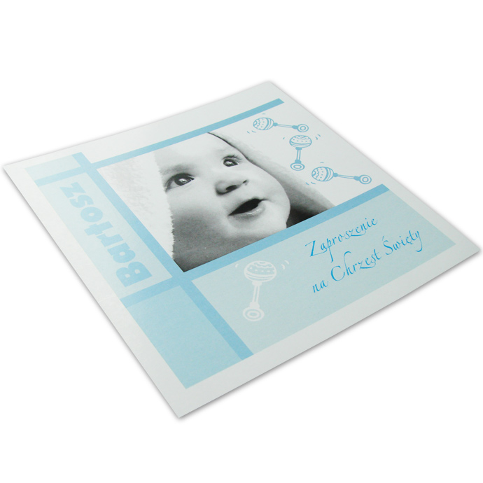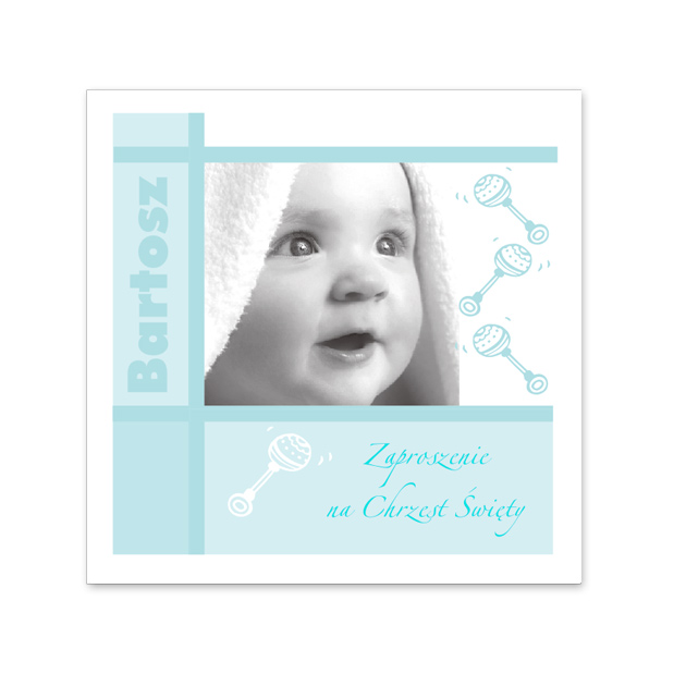 Zaproszenie na chrzest z najnowszej kolekcji. Na okładce znajduje się błękitna ramka wewnątrz której drukowane jest zdjęcie Państwa dziecka. Pod zdjęciem widnieje napis „Zaproszenie na Chrzest Święty”. Okładka ozdobiona została błękitnymi grzechotkami. Po lewej stronie drukujemy imię Państwa dziecka. Całość utrzymana w tonacji błękitnej. Prosimy o dosłanie zdjęcia w pliku jpg. w rozdzielczości min. 300dpi bądź w pliku tif. Istnieje możliwość wykonania własnego projektu.