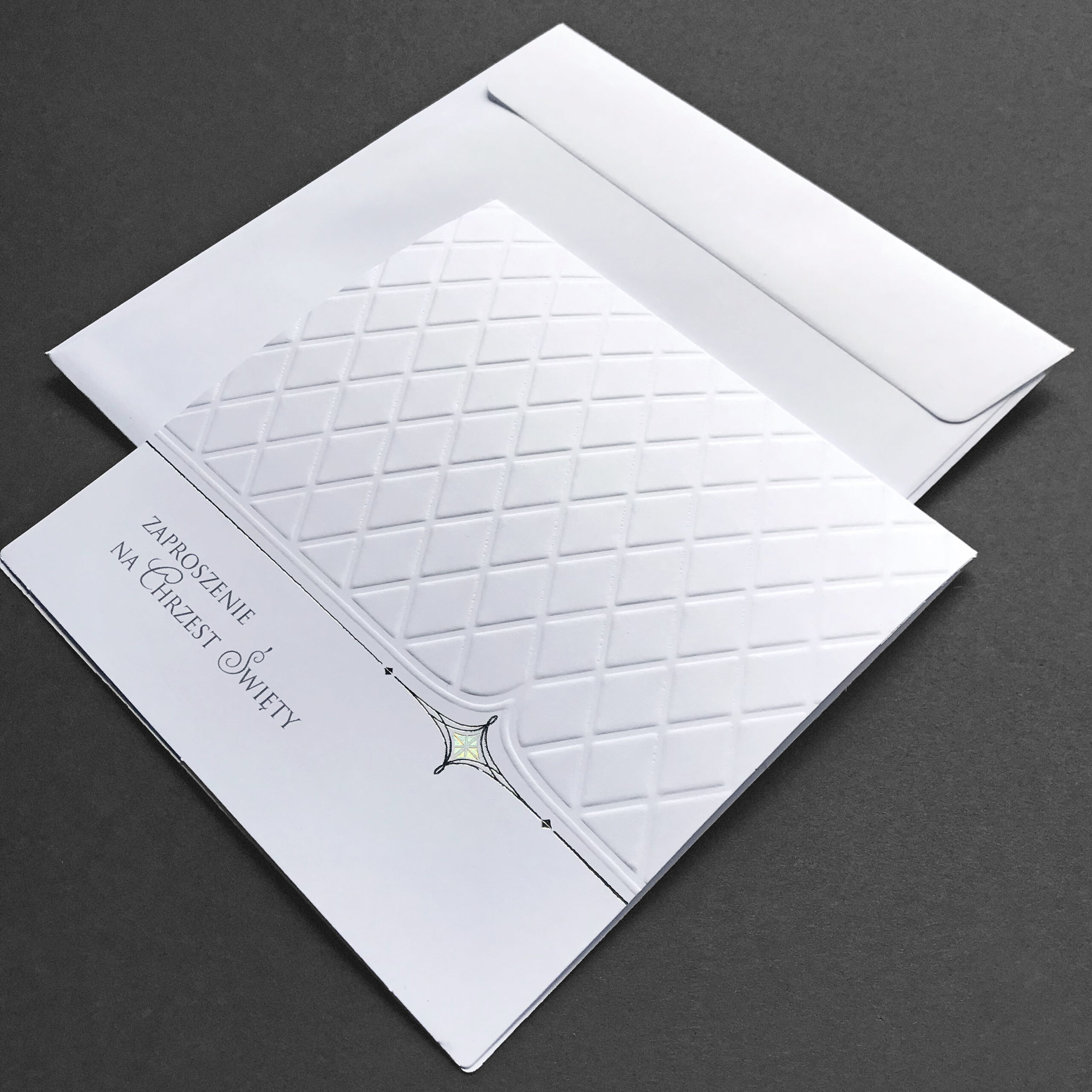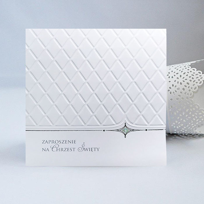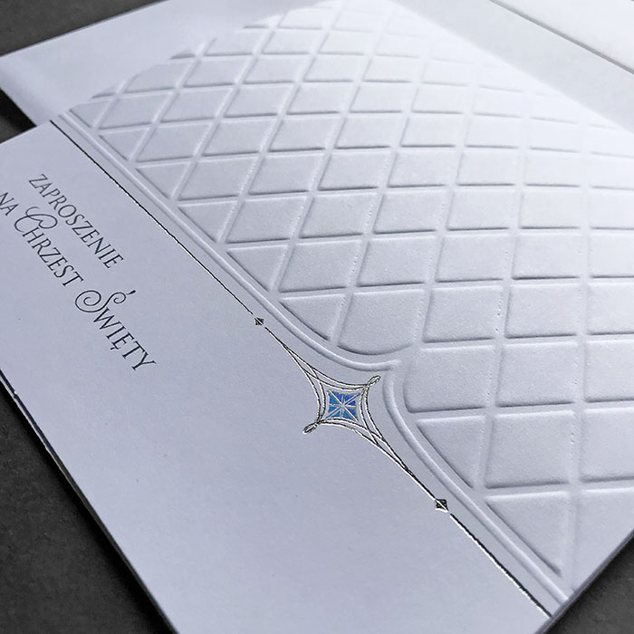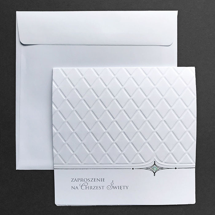 Zaproszenie na chrzest św. wykonane z wysokiej jakości matowego papieru w kolorze białym. Na okładce znajduje się wytłoczona delikatna krateczka oraz subtelny srebrny ornament. Dodatkową ozdobą jest delikatne zdobienie wykonane folią holograficzną, która pod wpływem światła wydobywa świetliste refleksy.Wkładka do nadruku w kolorze białym. Zaproszenie wysyłamy w formie gotowej do wręczenia. Zaproszenie wykonane z ogromną starannością i dbałością o detale. Precyzyjny nadruk, dokładność wykonania oraz wysokiej jakości papier. OKŁADKA: gramatura 250 g/m2 WKŁADKA: gramatura 120 g/m2 KOPERTA: Do zaproszenia dodawana jest gratis ozdobna koperta o gramaturze 120 g/m2. TREŚĆ: dowolna