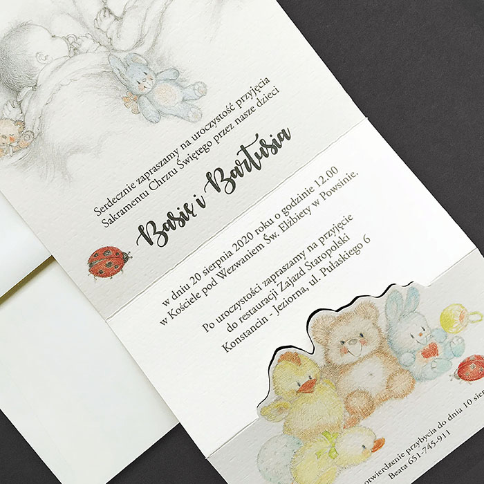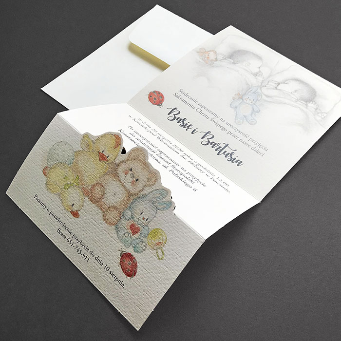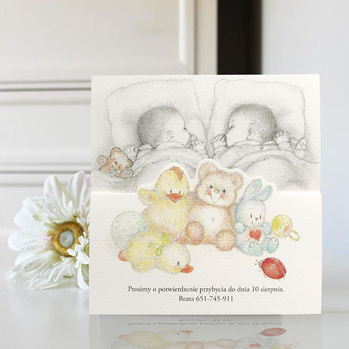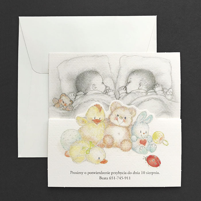 Wyjątkowe zaproszenie dla bliźniąt. Wykonane z wysokiej jakości papieru o delikatnej fakturze w kolorze kremowym. Zaproszenie wysyłamy w formie gotowej do wręczenia. Zaproszenie wykonane z ogromną starannością i dbałością o detale. Precyzyjny nadruk, dokładność wykonania