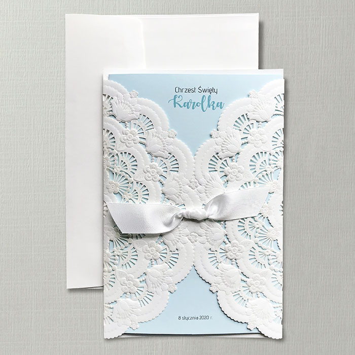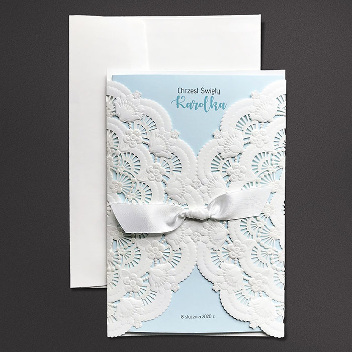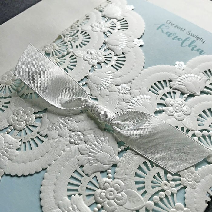 Zaproszenie z ozdobną okładką w formie kieszonki, z efektownym motywem wyciętym laserowo i wytłoczonym. Uroku dodaje satynowa wstążka, znajdująca się w centralnej części zaproszenia. Nadruk tekstu wykonywany jest matowej niebieskiej wkładce. Zaproszenie wysyłamy w formie gotowej do wręczenia. Zaproszenie wykonane z ogromną starannością i dbałością o detale. Precyzyjny nadruk, dokładność wykonania oraz wysokiej jakości papier.