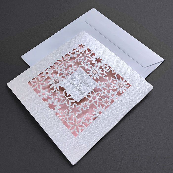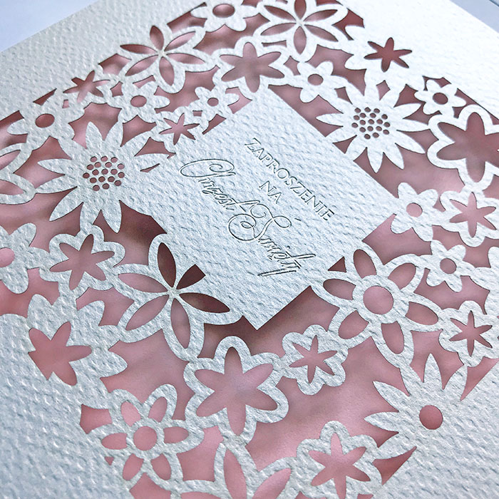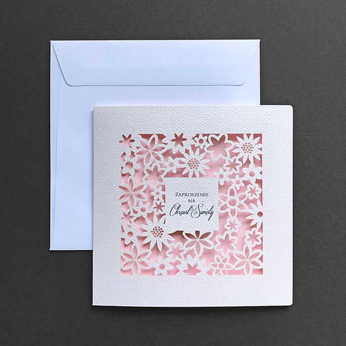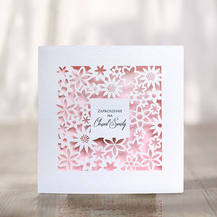 Zaproszenia na chrzest święty, wykonane z wysokiej jakości perłowego fakturowanego papieru z motywem wykonanym techniką ciecia laserowego i subtelnego srebrzenia. Wkładka do nadruku w kolorze jasno różowym. Zaproszenie wysyłamy w formie gotowej do wręczenia. Zaproszenie wykonane z ogromną starannością i dbałością o detale. Precyzyjny nadruk, dokładność wykonania oraz wysokiej jakości papier.