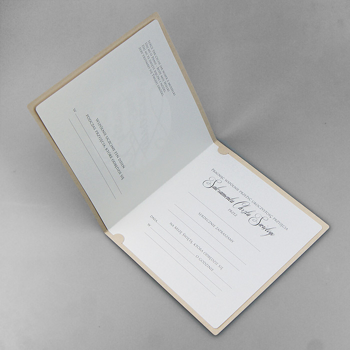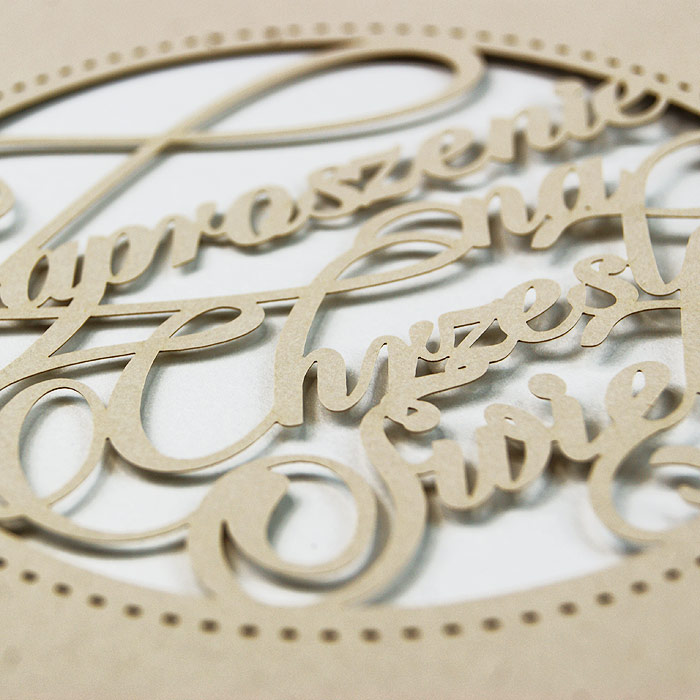 Zaproszenia na chrzest święty, wykonane z wysokiej jakości perłowego papieru z motywem wykonanym techniką ciecia laserowego.