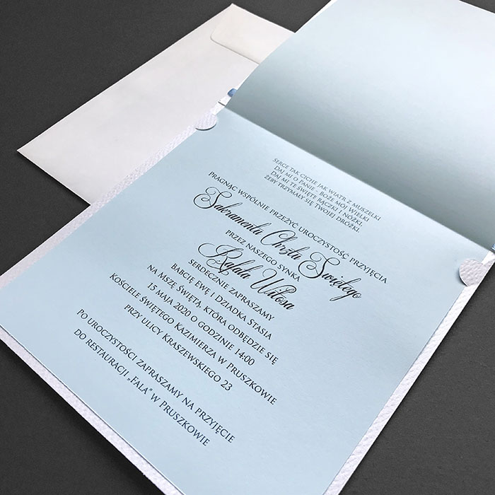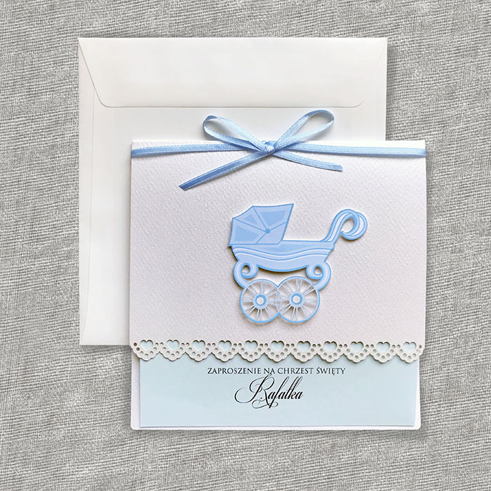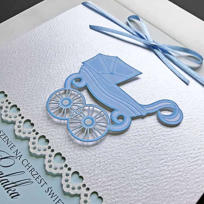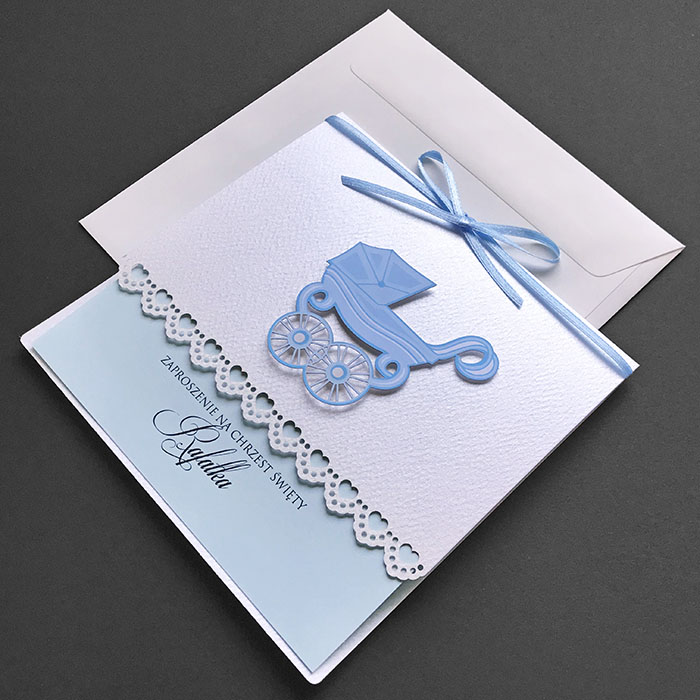 Zaproszenia na chrzest święty, wykonane z wysokiej jakości perłowego papieru z delikatną fakturą. Uroku dodaje nadrukowana oraz wycięta laserowo aplikacja w postaci wózeczka. Zaproszenie przewiązane satynową wstążką. Wkładka do nadruki jasno niebieska matowa. Zaproszenie wysyłamy w formie gotowej do wręczenia. Zaproszenie wykonane z ogromną starannością i dbałością o detale. Precyzyjny nadruk, dokładność wykonania oraz wysokiej jakości papier.