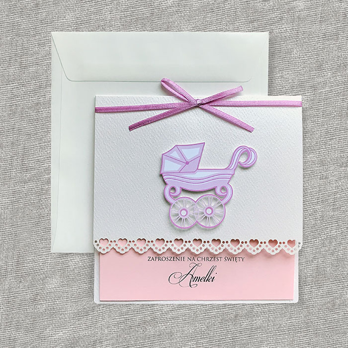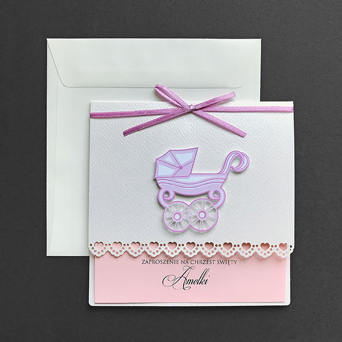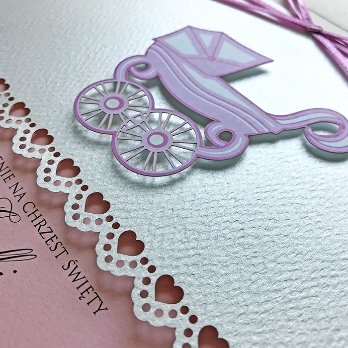 Zaproszenia na chrzest święty, wykonane z wysokiej jakości perłowego papieru z delikatną fakturą. Uroku dodaje nadrukowana oraz wycięta laserowo aplikacja w postaci wózeczka. Zaproszenie przewiązane satynową wstążką. Wkładka do nadruku z matowego papieru w kolorze jasnego różu. Zaproszenie wysyłamy w formie gotowej do wręczenia. Zaproszenie wykonane z ogromną starannością i dbałością o detale. Precyzyjny nadruk, dokładność wykonania oraz wysokiej jakości papier.