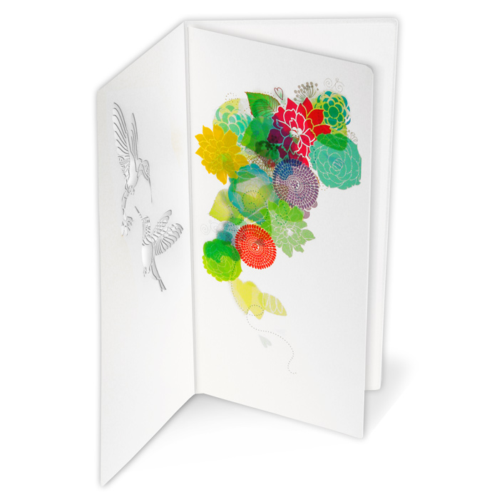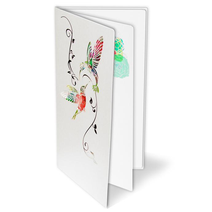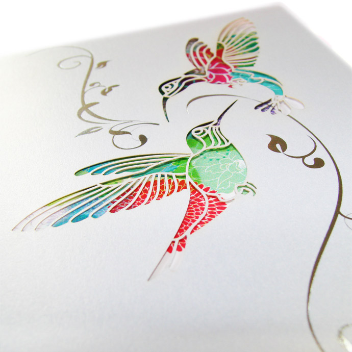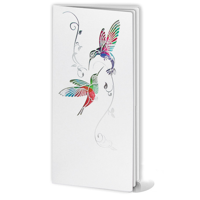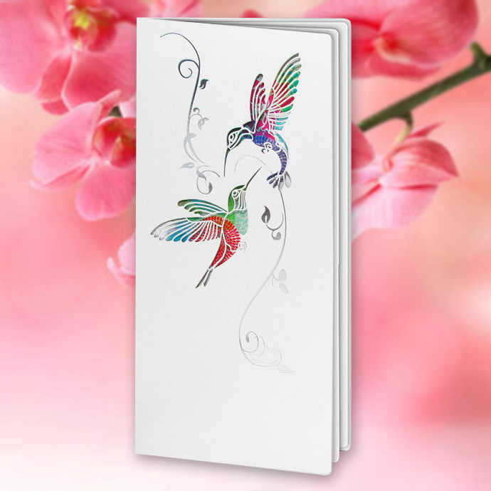 Oryginalne zaproszenie z najnowszej kolekcji wykonane z białego, perłowego papieru. Na okładce widnieją dwa wycięte laserowo kolibry oraz wysrebrzone gałązki. Najciekawszym elementem zaproszenia jest nadruk wykonany na pierwszej stronie wkładki. Przedstawia on kolorowe kwiaty, które nadają tło wyciętym w okładce ptaszkom. Wkładka do nadruku w kolorze białym. Zaproszenie wysyłamy w formie gotowej do wręczenia. Zaproszenie wykonane z ogromną starannością i dbałością o detale. Precyzyjny nadruk, dokładność wykonania oraz wysokiej jakości papier.