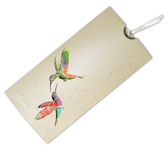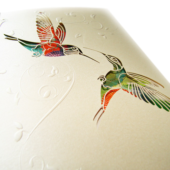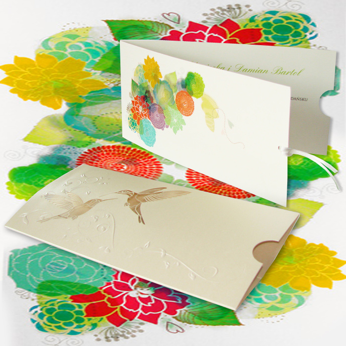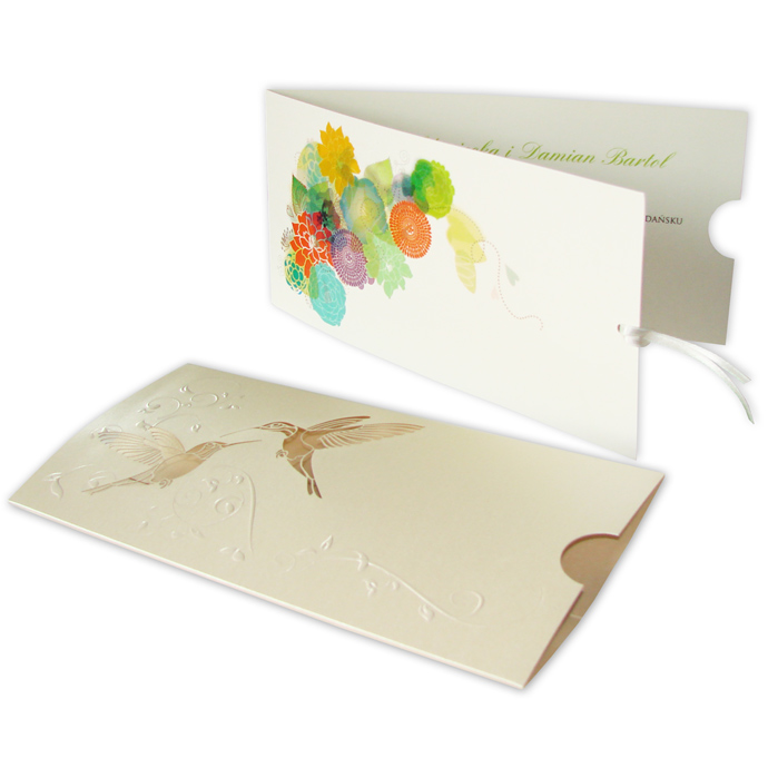 Oryginalne zaproszenie z najnowszej kolekcji wykonane z perłowego papieru w kolorze ecru. Na okładce widnieją dwa wycięte laserowo kolibry oraz tłoczony motyw kwiatowy. Najciekawszym elementem zaproszenia jest nadruk wykonany na pierwszej stronie wkładki. Przedstawia on kolorowe kwiaty, które nadają tło wyciętym w okładce ptaszkom. Wkładka do nadruku w kolorze ecru, do której przymocowana jest satynowa wstążka w kolorze ecru. Zaproszenie wysyłamy w formie gotowej do wręczenia. Zaproszenie wykonane z ogromną starannością i dbałością o detale. Precyzyjny nadruk, dokładność wykonania oraz wysokiej jakości papier.