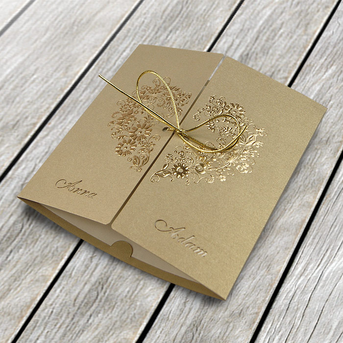 Eleganckie zaproszenie z najnowszej kolekcji. Okładka wykonana z perłowego papieru w kolorze ecru. Na okładce umieszczone są dwa przeplatające się złocone serca. Wkładka matowa w kolorze ecru. Nadruk inicjałów na okładce w cenie zaproszenia. Istnieje możliwość wyzłocenia inicjałów młodej pary za dodatkową opłatą 300 zł. Jest to koszt związany z przygotowaniem matrycy i wykonaniem złocenia. Zaproszenie wysyłamy w formie gotowej do wręczenia. Zaproszenie wykonane z ogromną starannością i dbałością o detale. Precyzyjny nadruk, dokładność wykonania oraz wysokiej jakości papier.