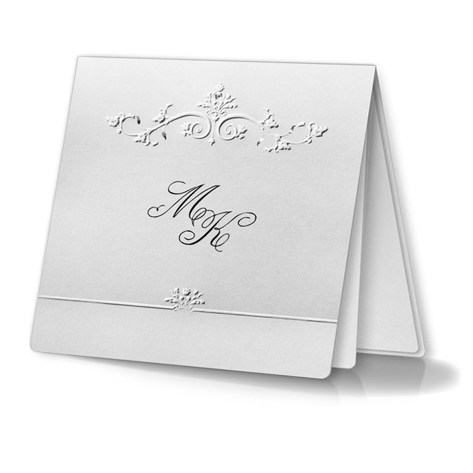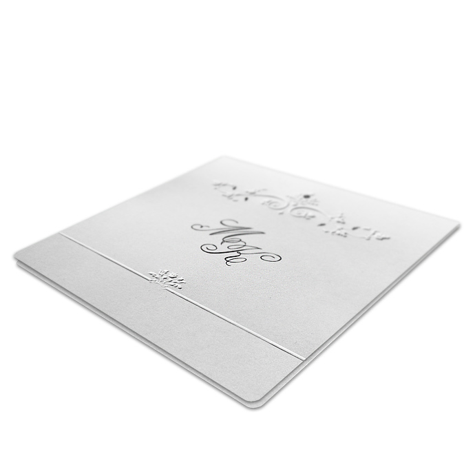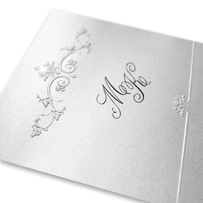 Zaproszenie ślubne z najnowszej kolekcji wykonane z białego, perłowego papieru. Okładka ozdobiona delikatnym tłoczeniem oraz srebrzeniem. Na okładce drukowane są inicjały Młodej Pary. Wkładka do nadruku wykonana z białego, matowego papieru. Zaproszenie wysyłamy w formie gotowej do wręczenia. Zaproszenie wykonane z ogromną starannością i dbałością o detale. Precyzyjny nadruk, dokładność wykonania oraz wysokiej jakości papier.