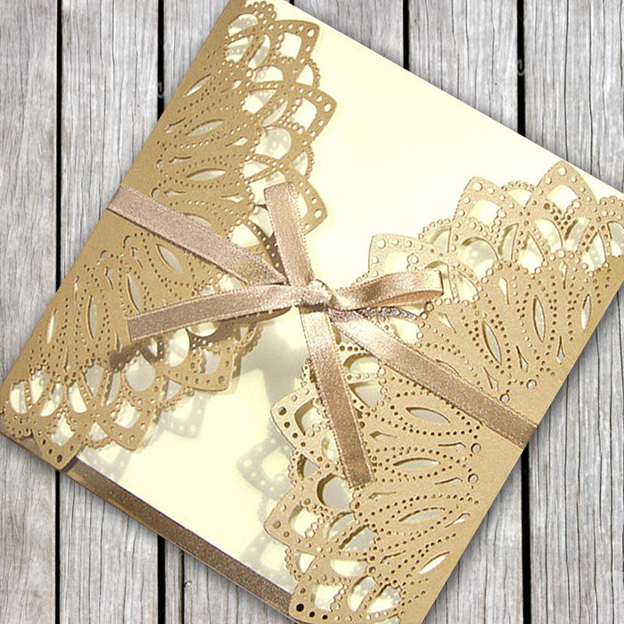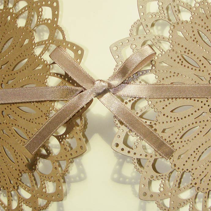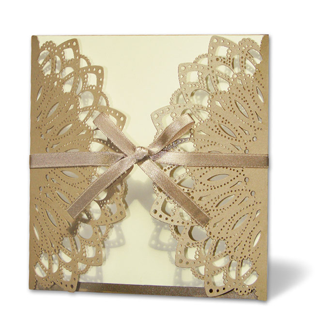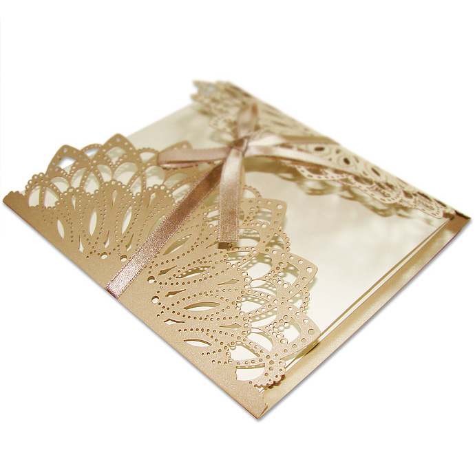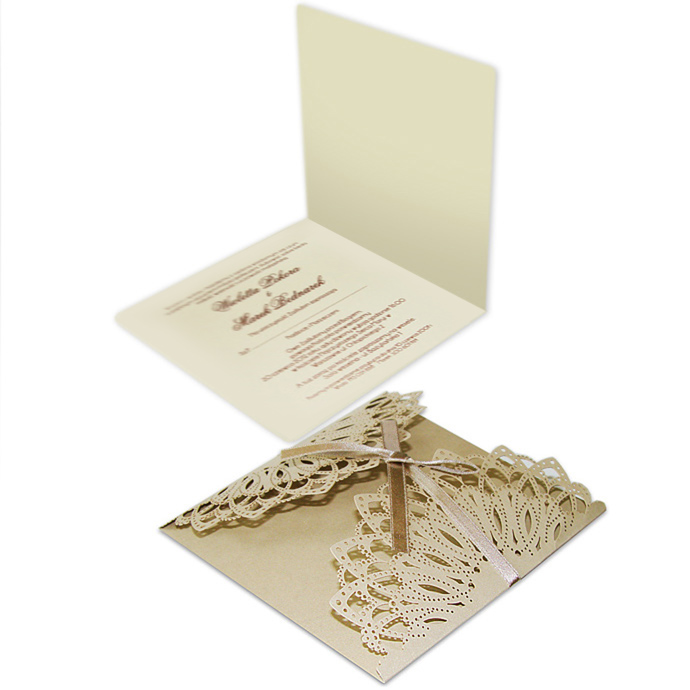 Zaproszenie wykonane z perłowego papieru w kolorze beżowym. Okładkę ozdabia oryginalne wycięcie laserowe. Wkładka do nadruku tekstu wykonana z matowego papieru w kolorze ecru. Całość przewiązuje złota, satynowa wstążka. Zaproszenie wysyłamy w formie gotowej do wręczenia. Zaproszenie wykonane z ogromną starannością i dbałością o detale. Precyzyjny nadruk, dokładność wykonania oraz wysokiej jakości papier.