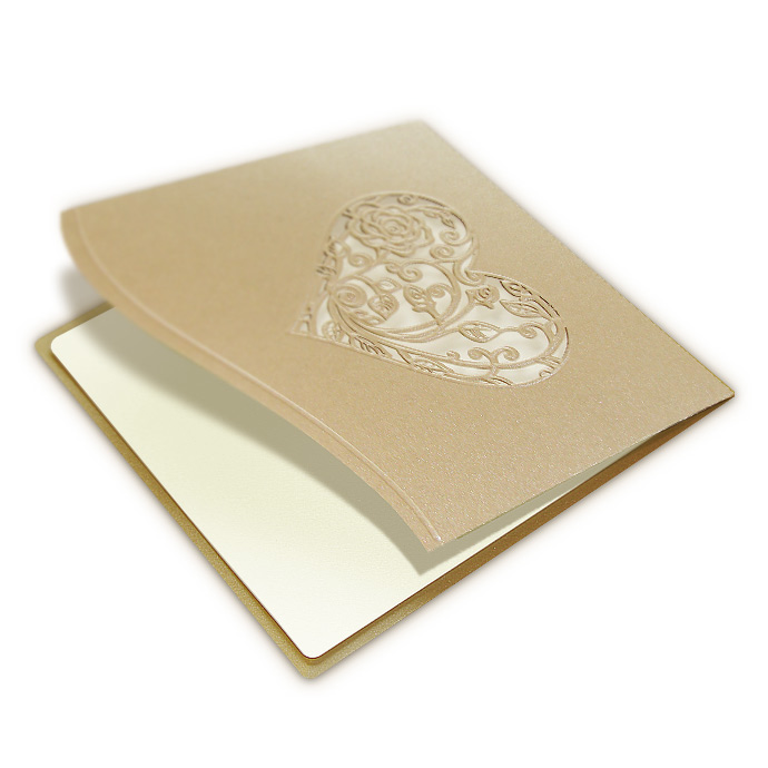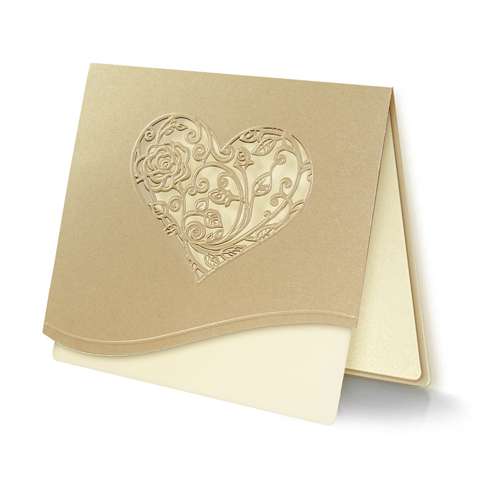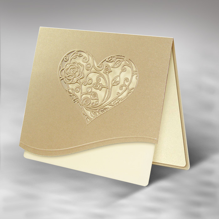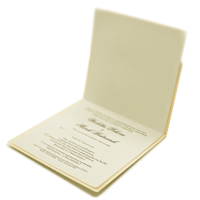 Zaproszenie wykonane z metalizowanego papieru w kolorze beżowym. Okładka ozdobiona oryginalnym sercem wyciętym w okładce. Dół zaproszenia ozdobiony falką oraz tłoczeniem. Wkładka do nadruku matowa w kolorze ecru.