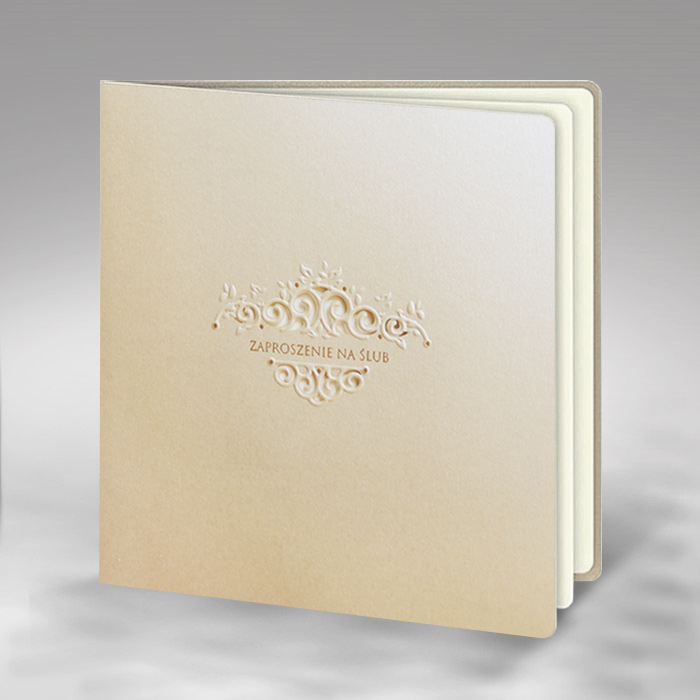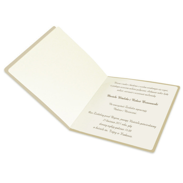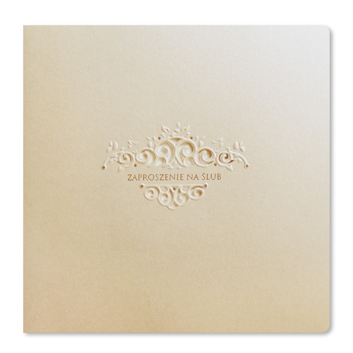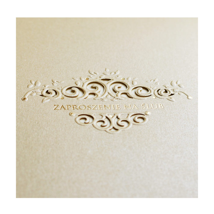 Okładka zaproszenia wykonana z metalizowanego papieru w kolorze beżowym. Ornament jest wycięty laserem oraz dodatkowo wytłoczony. Napis „Zaproszenie na ślub” oraz kropeczki wyzłocone. Środek ecru matowy.