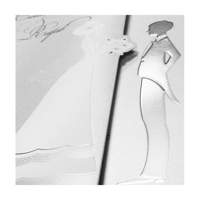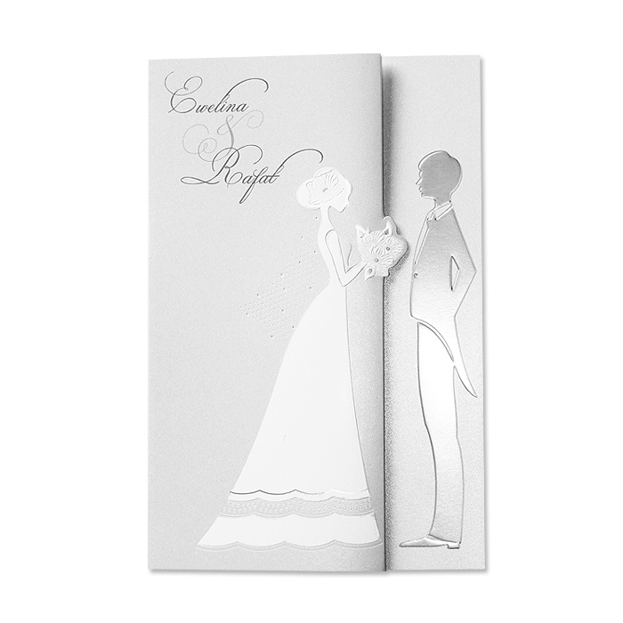Eleganckie zaproszenie z najnowszej kolekcji. Okładka wykonana z perłowego papieru w kolorze białym. Na okładce widnieje Młoda Para. Pan Młody w kolorze srebrnym, natomiast Panna Młoda cała w bieli, trzyma bukiet kwiatów. Dodatkową ozdobą są tłoczenia. Nadruk tekstu bezpośrednio na zaproszeniu. W prawym górnym rogu nadrukowane imiona Młodej Pary. Zaproszenie wysyłamy w formie gotowej do wręczenia. Zaproszenie wykonane z ogromną starannością i dbałością o detale. Precyzyjny nadruk, dokładność wykonania oraz wysokiej jakości papier.