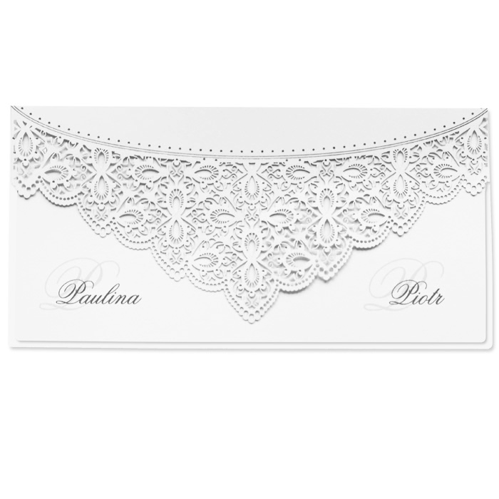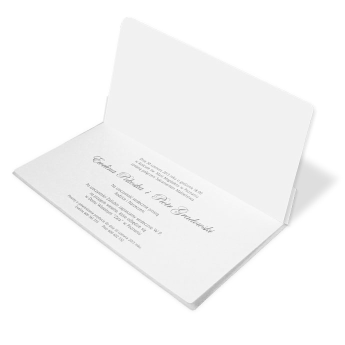 Oryginalne zaproszenie wykonane z matowego papieru w kolorze białym. Okładka została wycięta techniką laserową. Cięcie tworzy ciekawy wzór, który dodatkowo ozdobiono srebrzonymi elementami. Środek matowy w kolorze białym.