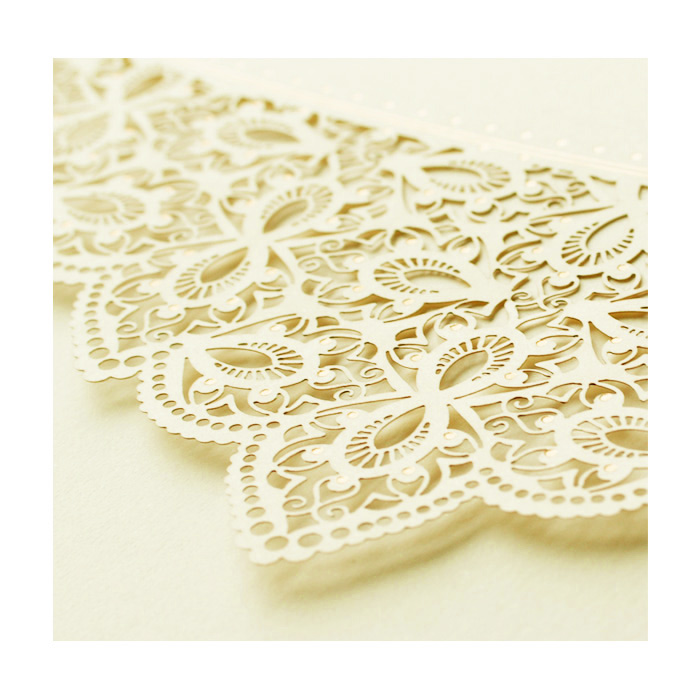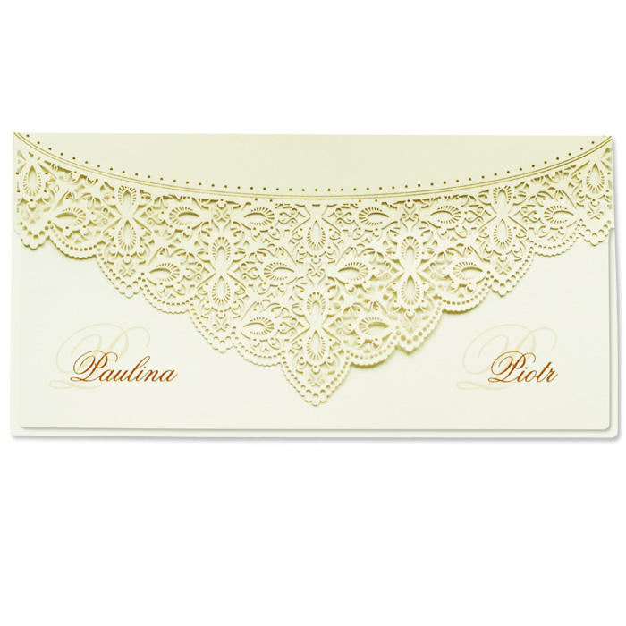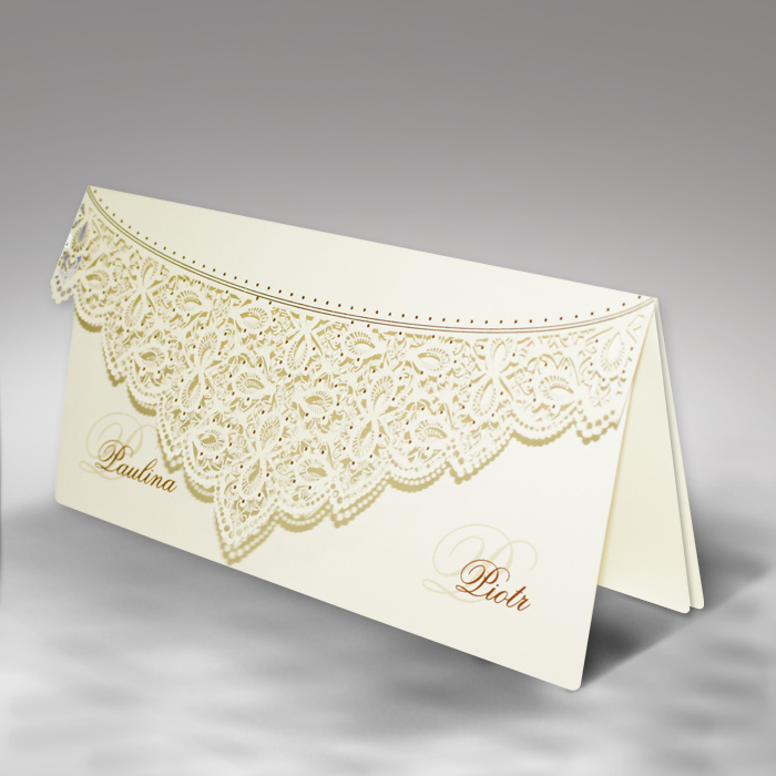 Oryginalne zaproszenie wykonane z matowego papieru w kolorze ecru. Okładka została wycięta techniką laserową. Cięcie tworzy ciekawy wzór, który dodatkowo ozdobiono złoconymi elementami. Środek matowy w kolorze ecru.