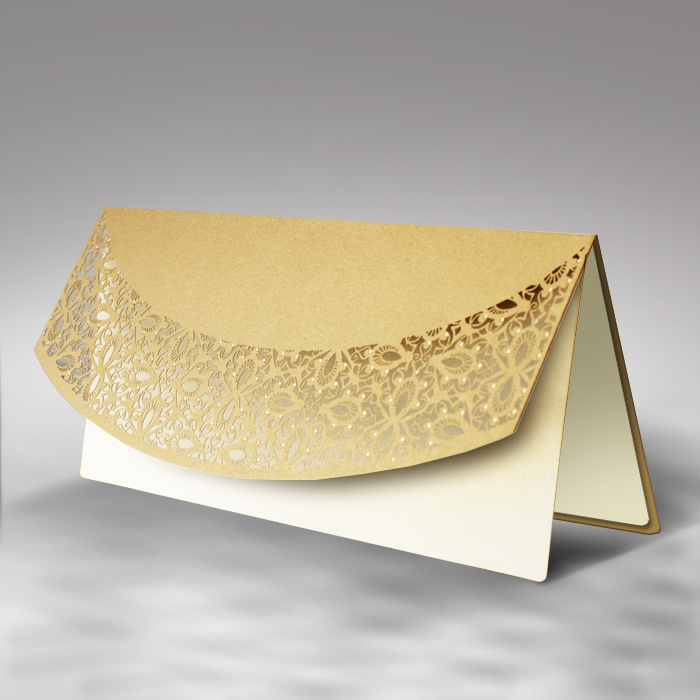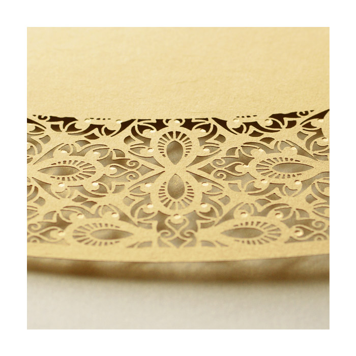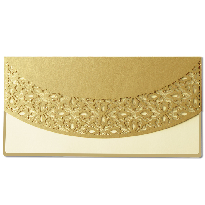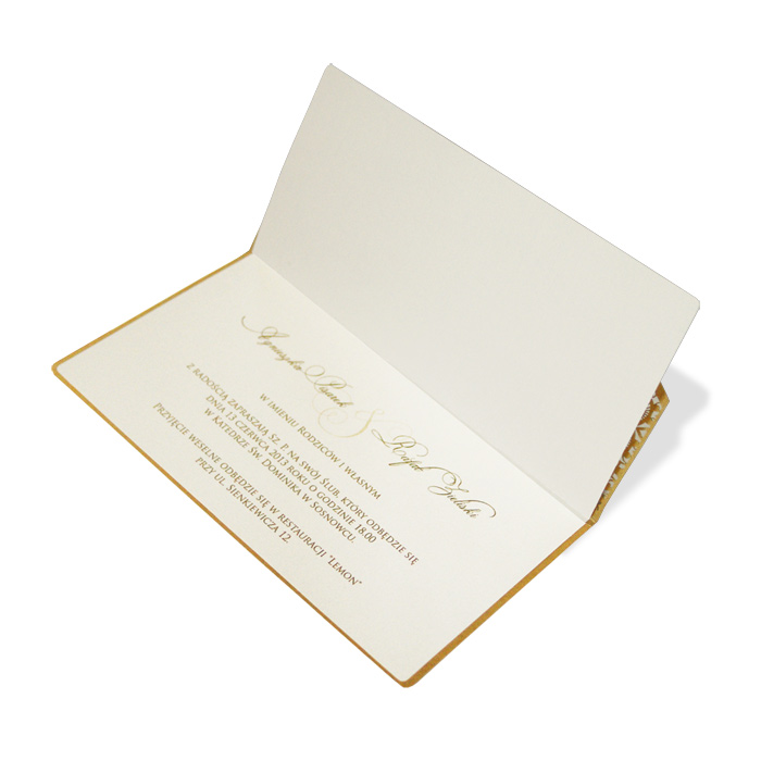 Eleganckie zaproszenie z najnowszej kolekcji wykonane z metalizowanego papieru w kolorze złotym. Przód zaproszenia krótszy, zaokrąglony. Został wycięty techniką laserową fantazyjny wzór. Dodatkową ozdobą są złocone elementy. Zaproszenie wysyłamy w formie gotowej do wręczenia. Zaproszenie wykonane z ogromną starannością i dbałością o detale. Precyzyjny nadruk, dokładność wykonania oraz wysokiej jakości papier. Wkładka do nadruku metalizowana w kolorze ecru.