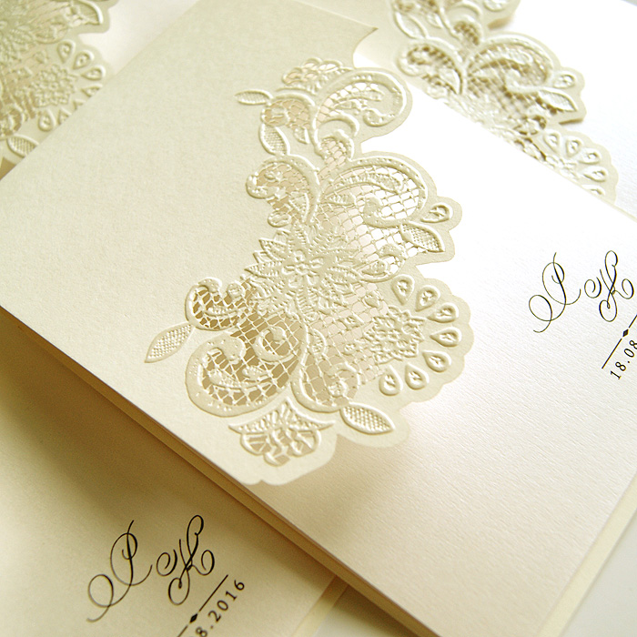 Bardzo eleganckie zaproszenie wykonane z perłowego papieru w kolorze ecru. Na okładce zostali wycięte inicjały. Całość przewiązuje atlasowa wstążka z przyklejoną aplikacją z wyzłoconym napisem „Zaproszenie na Ślub”. Wkładka matowa w kolorze ecru.