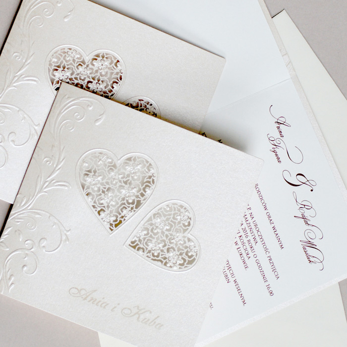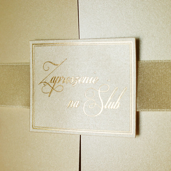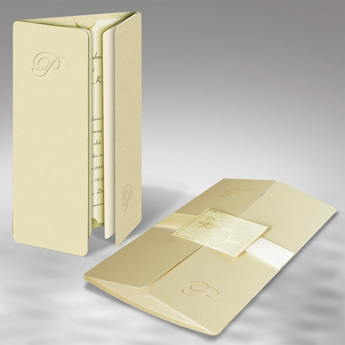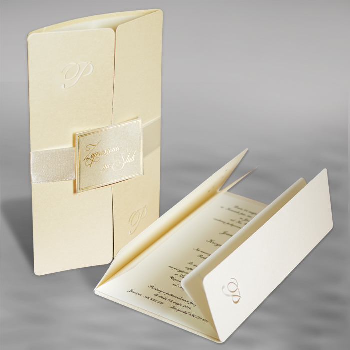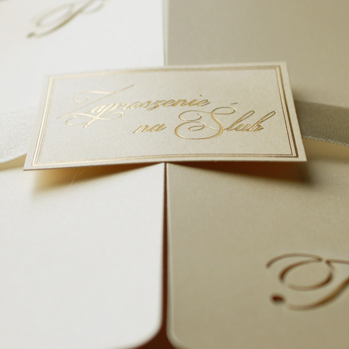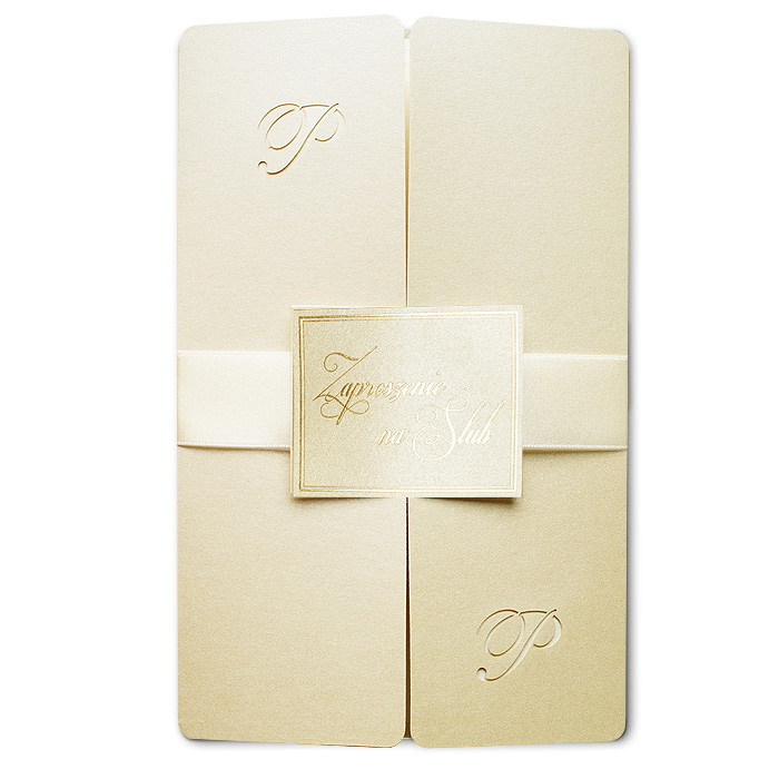 Bardzo eleganckie zaproszenie wykonane z perłowego papieru w kolorze ecru. Na okładce zostali wycięte inicjały. Całość przewiązuje atlasowa wstążka z przyklejoną aplikacją z wyzłoconym napisem „Zaproszenie na Ślub”. Wkładka matowa w kolorze ecru.