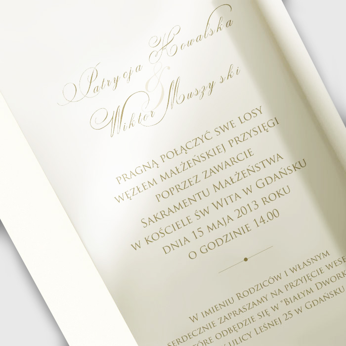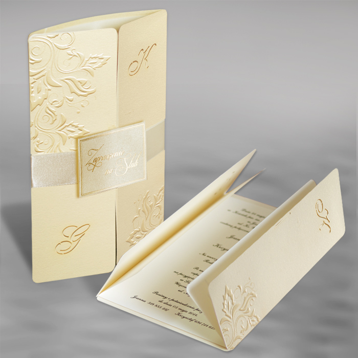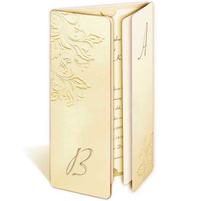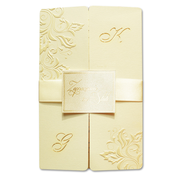 Bardzo eleganckie zaproszenie wykonane z papieru ecru mieniącego się na złoto. Na okładce został wytłoczony przepiękny motyw roślinny powleczony perłową folią. Na okładce istnieje możliwość wycięcia inicjałów. Całość przewiązuje atlasowa wstążka z przyklejoną aplikacją z wyzłoconym napisem „Zaproszenie na Ślub”. Wkładka metalizowana w kolorze ecru.