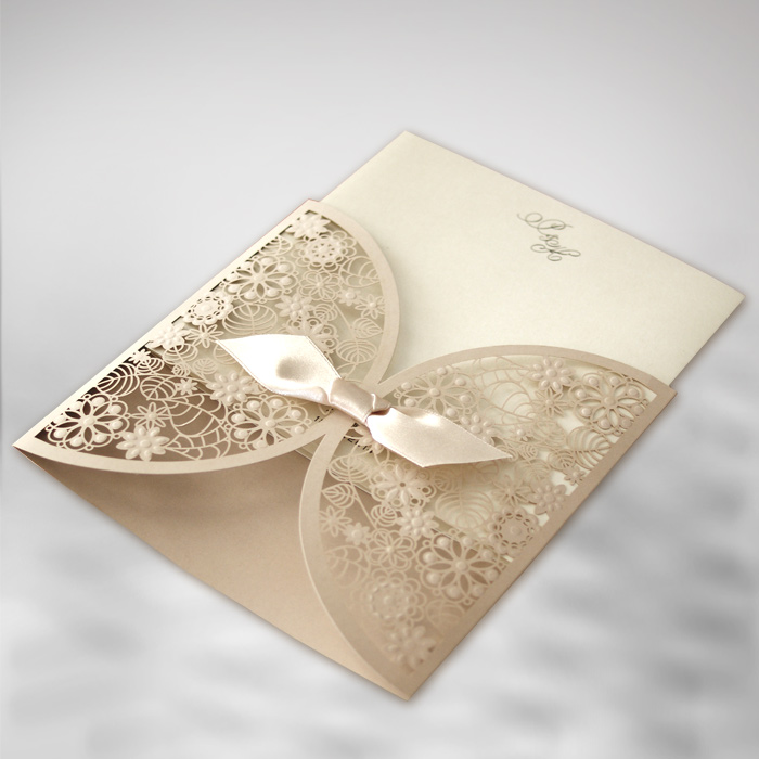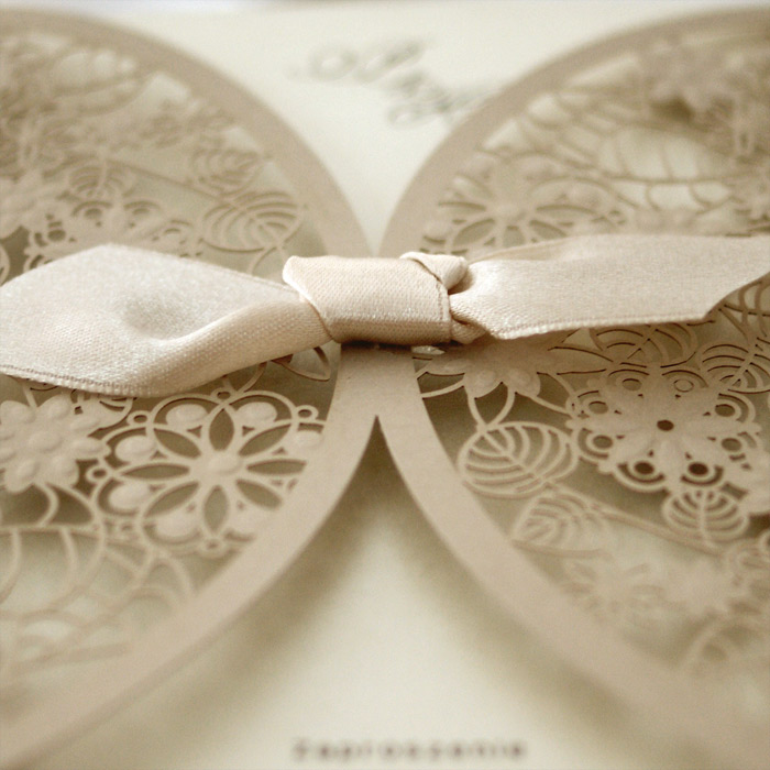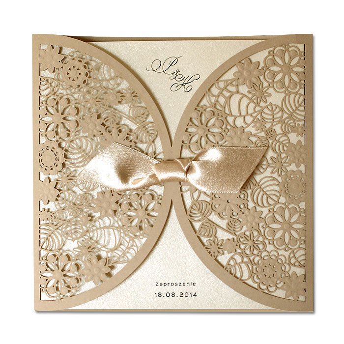 Zaproszenie wykonane z matowego papieru w kolorze beżowym. Okładkę ozdabia oryginalne wycięcie laserowe. Niektóre elementy zaproszenia zostały dodatkowo wytłoczone. Wkładka do nadruku perłowa lodowa. Dodatkową ozdobą jest satynowa wstążka. Zaproszenie wysyłamy w formie gotowej do wręczenia. Zaproszenie wykonane z ogromną starannością i dbałością o detale. Precyzyjny nadruk, dokładność wykonania oraz wysokiej jakości papier.