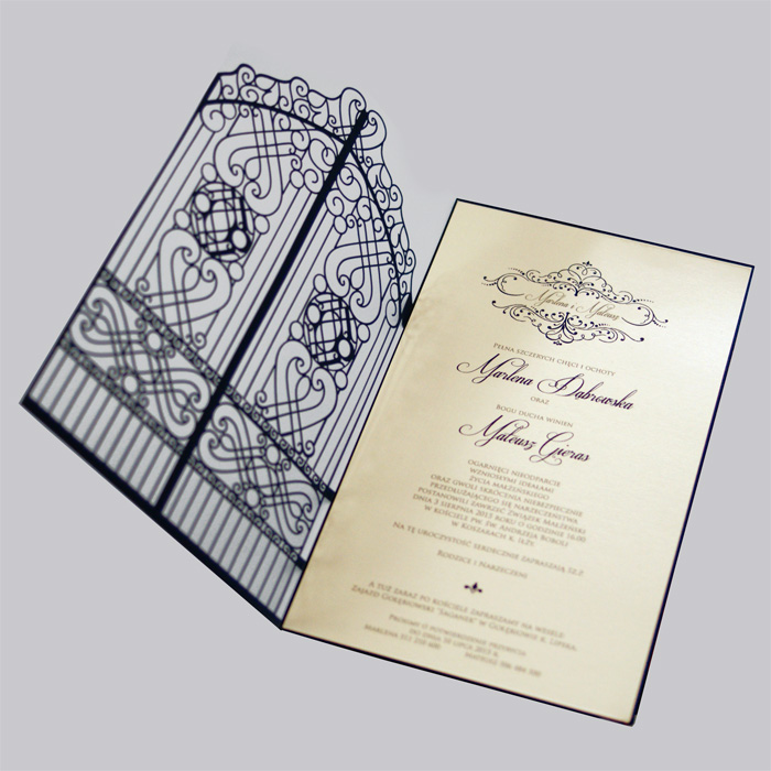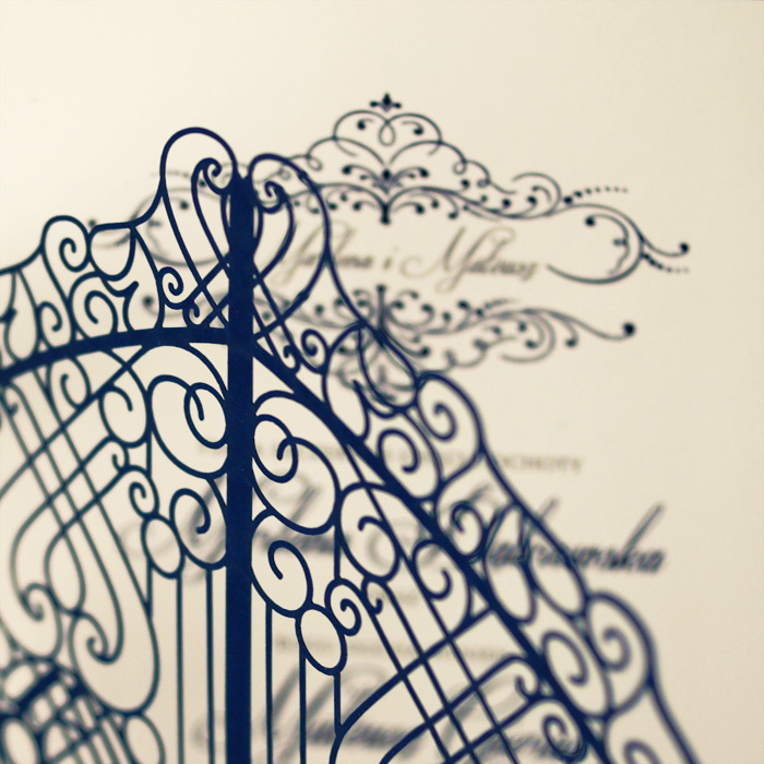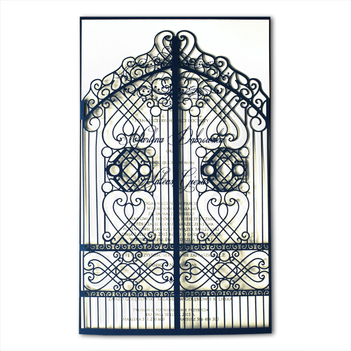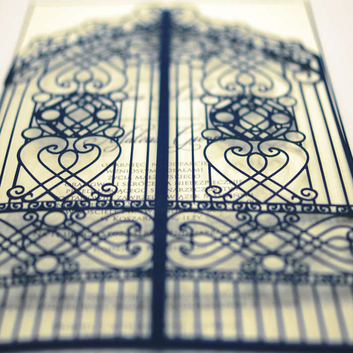 Okładka zaproszenia wykonana z ciemno niebieskiego gumowego papieru. Przód okładki cały wycięty w oryginalny ażurowy wzór przypominający bramę. Nadruk tekstu wykonujemy na sztywnej matowej wkładce w kolorze ecru.