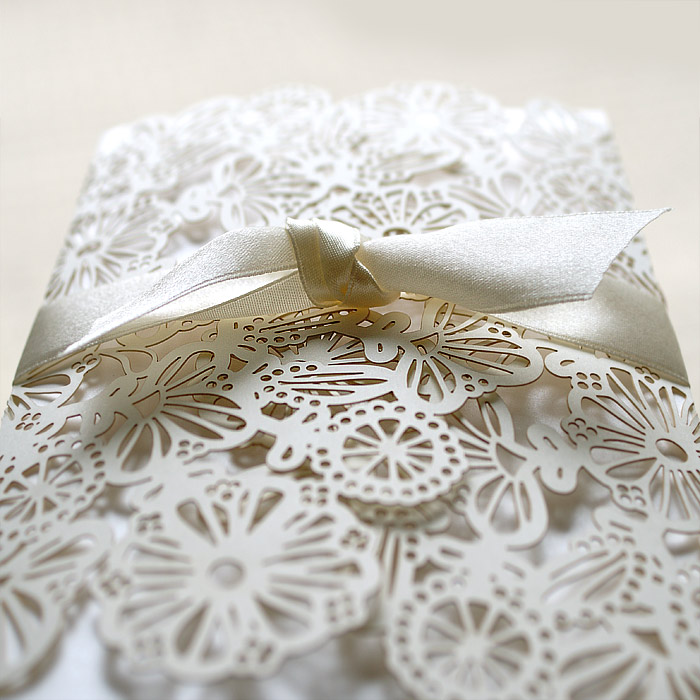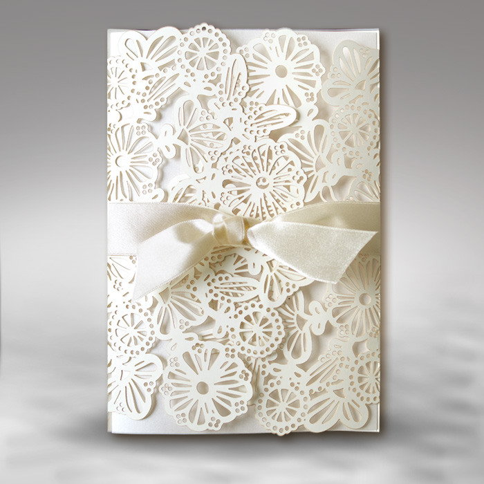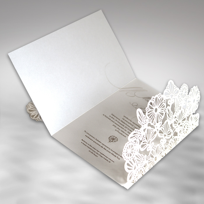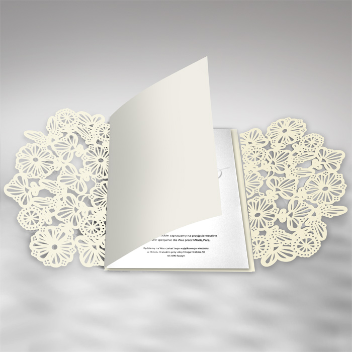 Zaproszenie wykonane z matowego papieru w kolorze ecru. Okładkę ozdabia oryginalne wycięcie laserowe. Wkładka do nadruku tekstu perłowa lodowa. Całość przewiązuje satynowa wstążka w kolorze ecru. Zaproszenie wysyłamy w formie gotowej do wręczenia. Zaproszenie wykonane z ogromną starannością i dbałością o detale. Precyzyjny nadruk, dokładność wykonania oraz wysokiej jakości papier.