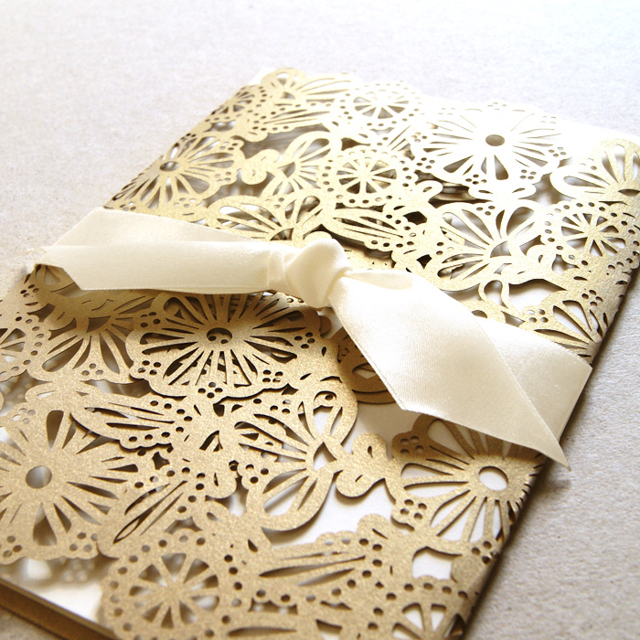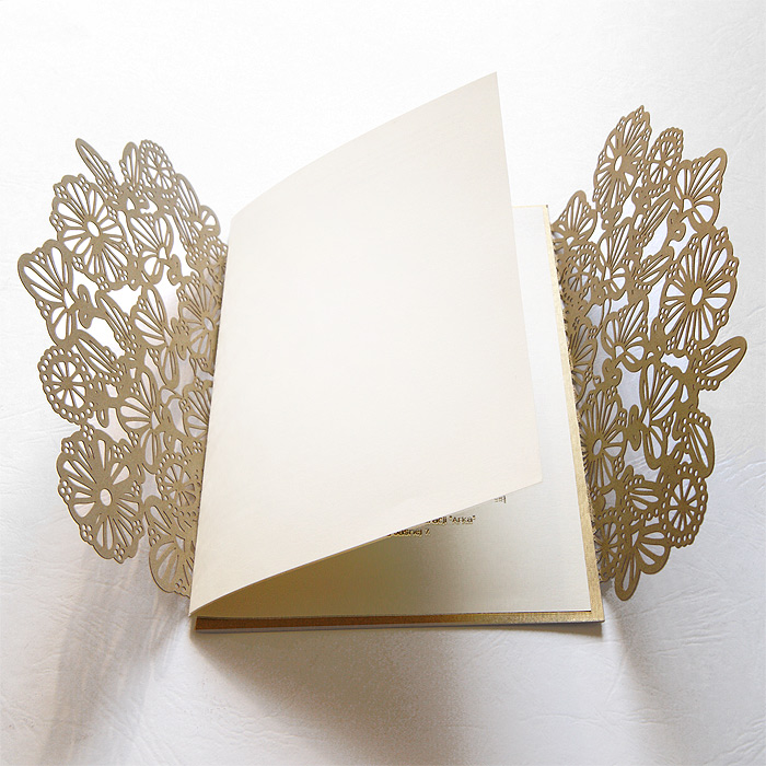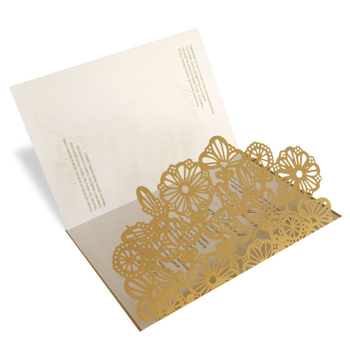 Zaproszenie wykonane z metalizowanego papieru w kolorze starego złota. Okładkę ozdabia oryginalne wycięcie laserowe. Wkładka do nadruku tekstu ecru matowa. Całość przewiązuje satynowa wstążka w kolorze ecru. Zaproszenie wysyłamy w formie gotowej do wręczenia. Zaproszenie wykonane z ogromną starannością i dbałością o detale. Precyzyjny nadruk, dokładność wykonania oraz wysokiej jakości papier.