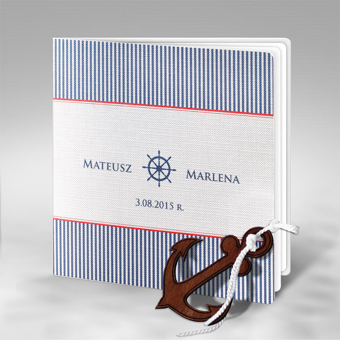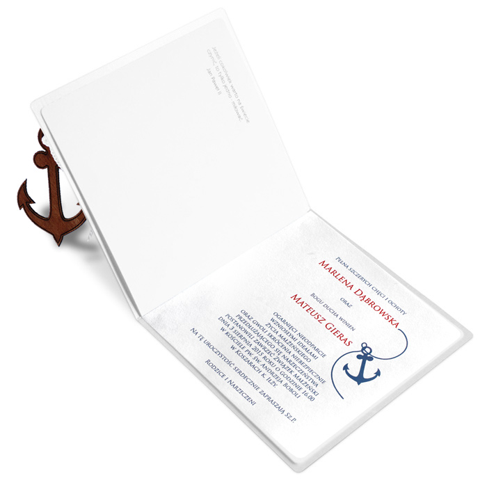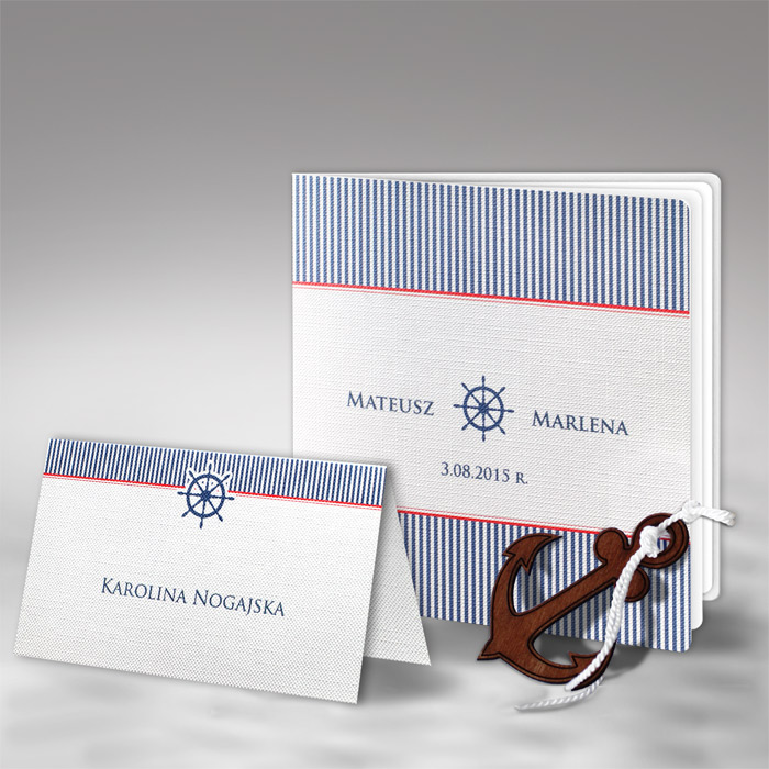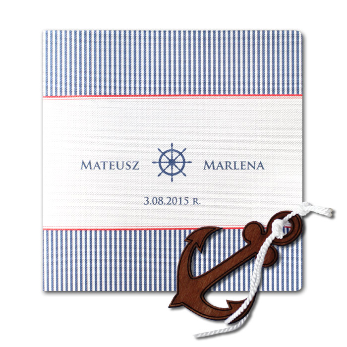 Oryginalne zaproszenie w stylu marynarskim. Wykonane z białego fakturowanego papieru. Nadruk tekstu wykonujemy na białej matowej wkładce. Do zaproszenia przy pomocy białego sznurka została przymocowana drewniana kotwica. Na okładce drukujemy imiona Młodych oraz datę ślubu.