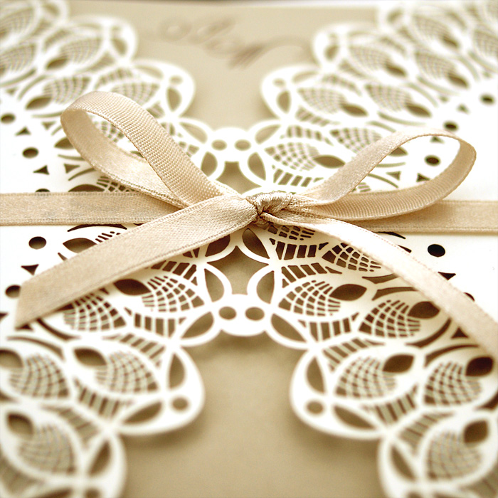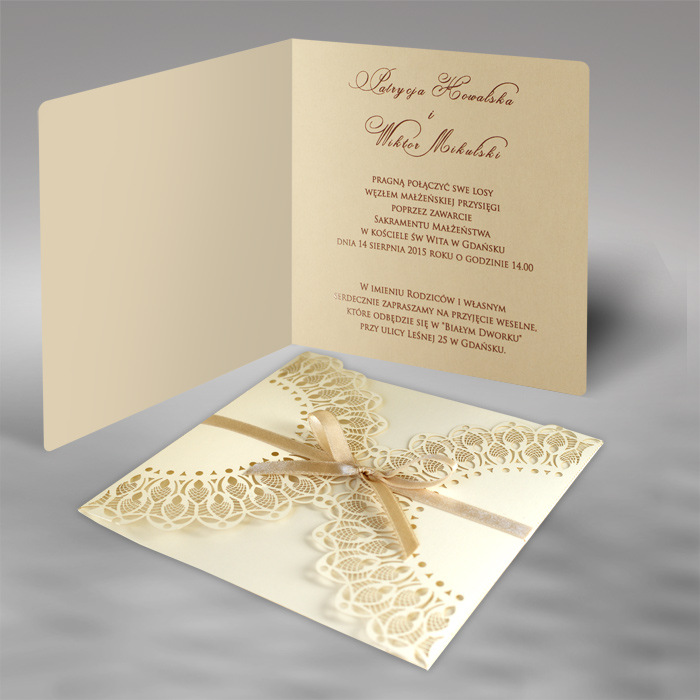 Zaproszenie wykonane z matowego papieru w kolorze ecru. Okładkę ozdabia oryginalne wycięcie laserowe. Wkładka do nadruku tekstu matowa w kolorze beżowym. Całość przewiązuje satynowa wstążka w kolorze złotym. Na pierwszej stronie wkładki drukujemy inicjały oraz datę Ślubu. Zaproszenie wysyłamy w formie gotowej do wręczenia. Zaproszenie wykonane z ogromną starannością i dbałością o detale. Precyzyjny nadruk, dokładność wykonania oraz wysokiej jakości papier.