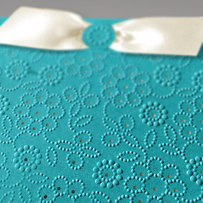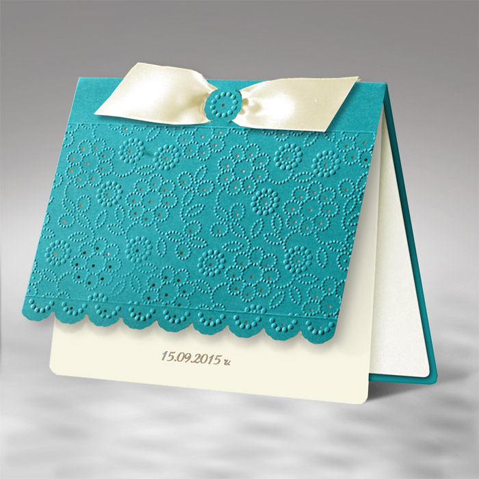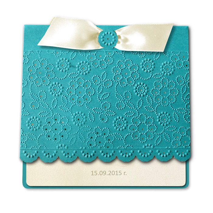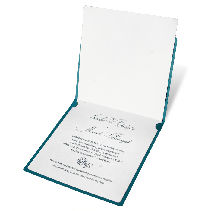Zaproszenie wykonane z matowego papieru w kolorze ciemno turkusowym. Przód zaproszenia jest krótszy. Okładkę ozdabiają delikatne tłoczenia oraz wycięcia laserowe. Wkładka do nadruku tekstu ecru matowa. Dodatkową ozdobą jest atłasowa wstążka w kolorze ecru przewleczona przez wycięcie w okładce. Na pierwszej stronie wkładki drukujemy datę Ślubu. Zaproszenie wysyłamy w formie gotowej do wręczenia. Zaproszenie wykonane z ogromną starannością i dbałością o detale. Precyzyjny nadruk, dokładność wykonania oraz wysokiej jakości papier.