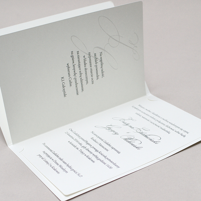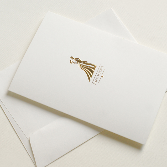 Eleganckie zaproszenie wykonane z matowego papieru w kolorze ecru. Wzór na okładce zaproszenia został wykonany metodą hot print złotą folią. Wkładka do nadruku tekstu ecru matowa.