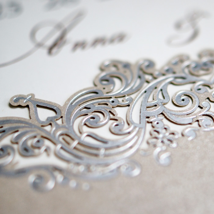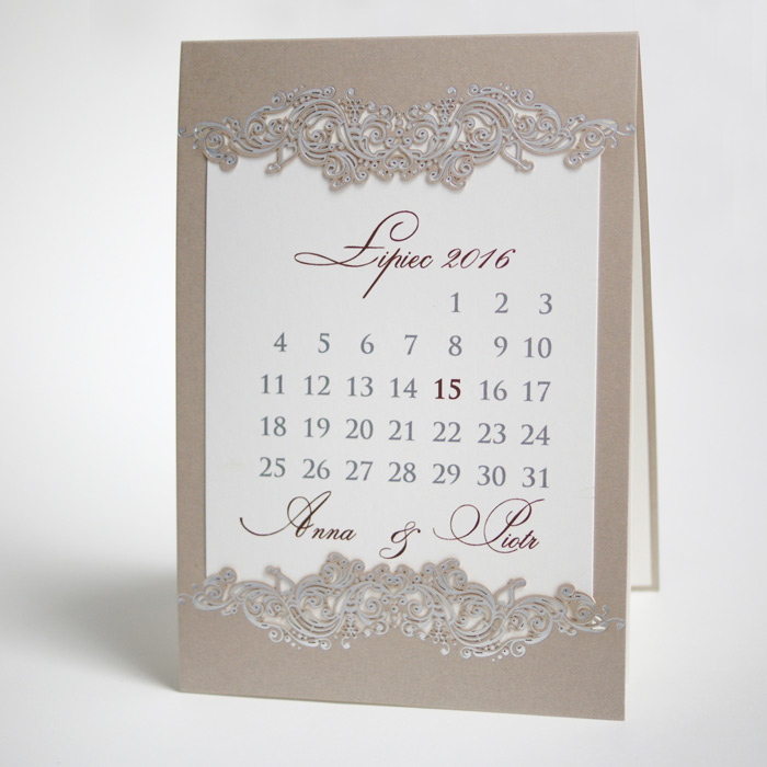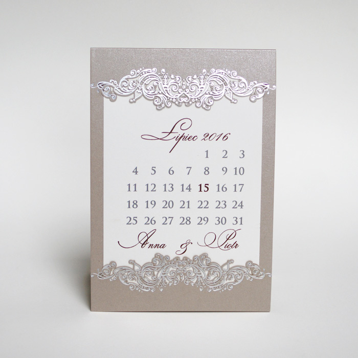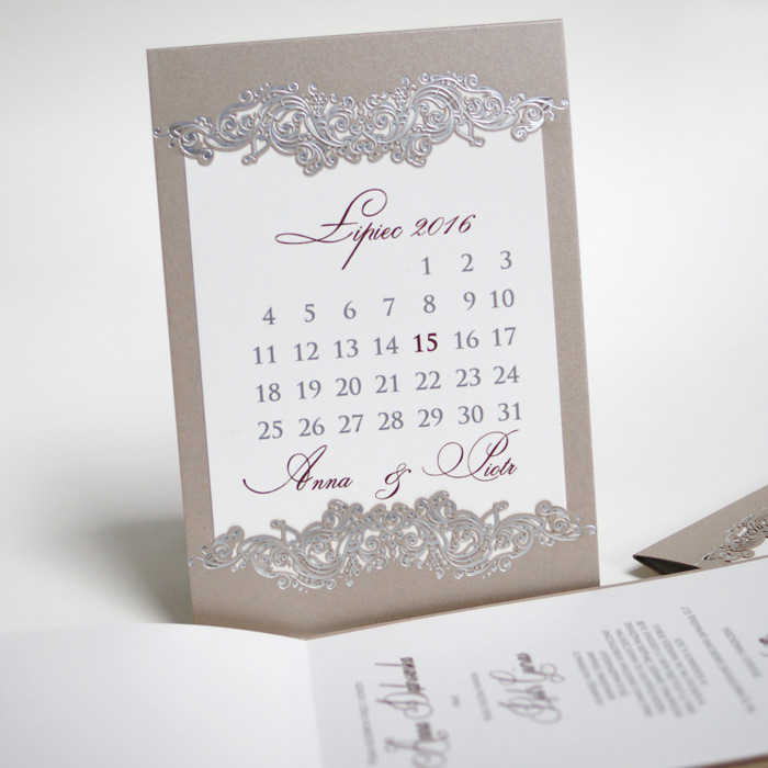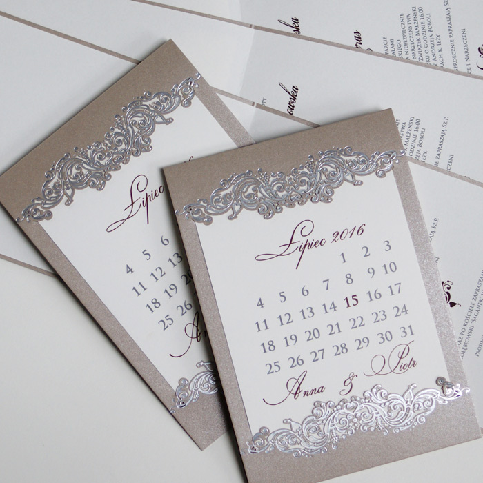 Oryginalne zaproszenie z najnowszej kolekcji przypominające kartkę z kalendarza z ozdobnym motywem wykonanym metodą hot print w kolorze srebrnym. Okładka wykonana z perłowego, beżowego papieru. Nadruk tekstu wykonywany jest na matowej wkładce w kolorze ecru. Zaproszenie wysyłamy w formie gotowej do wręczenia. Zaproszenie wykonane z ogromną starannością i dbałością o detale. Precyzyjny nadruk, dokładność wykonania oraz wysokiej jakości papier.