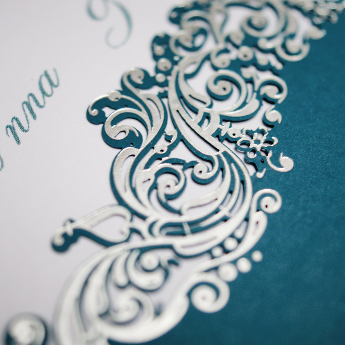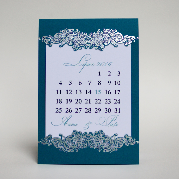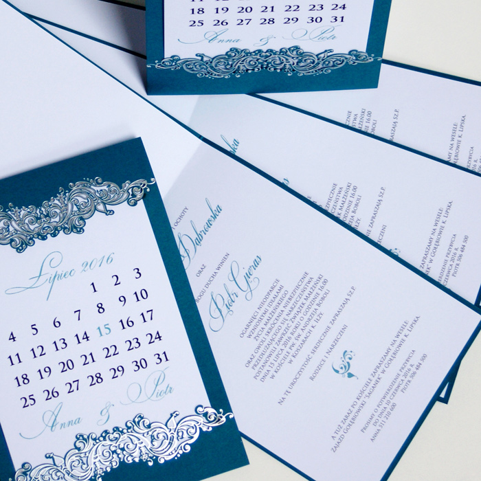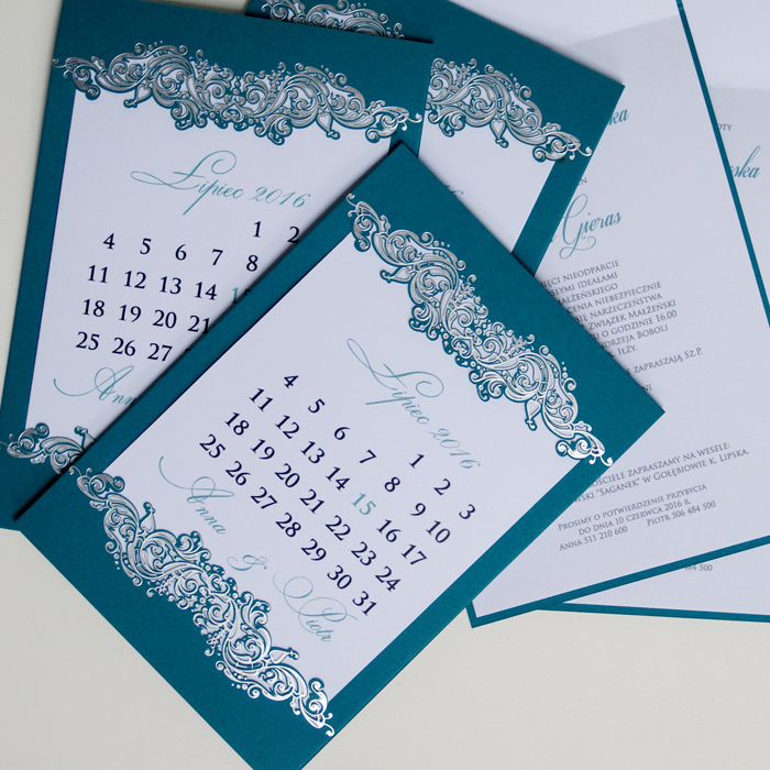 Oryginalne zaproszenie z najnowszej kolekcji przypominające kartkę z kalendarza z ozdobnym motywem wykonanym metodą hot print w kolorze srebrnym. Okładka wykonana papieru w turkusowym kolorze. Nadruk tekstu wykonywany jest na białej matowej wkładce. Zaproszenie wysyłamy w formie gotowej do wręczenia. Zaproszenie wykonane z ogromną starannością i dbałością o detale. Precyzyjny nadruk, dokładność wykonania oraz wysokiej jakości papier.