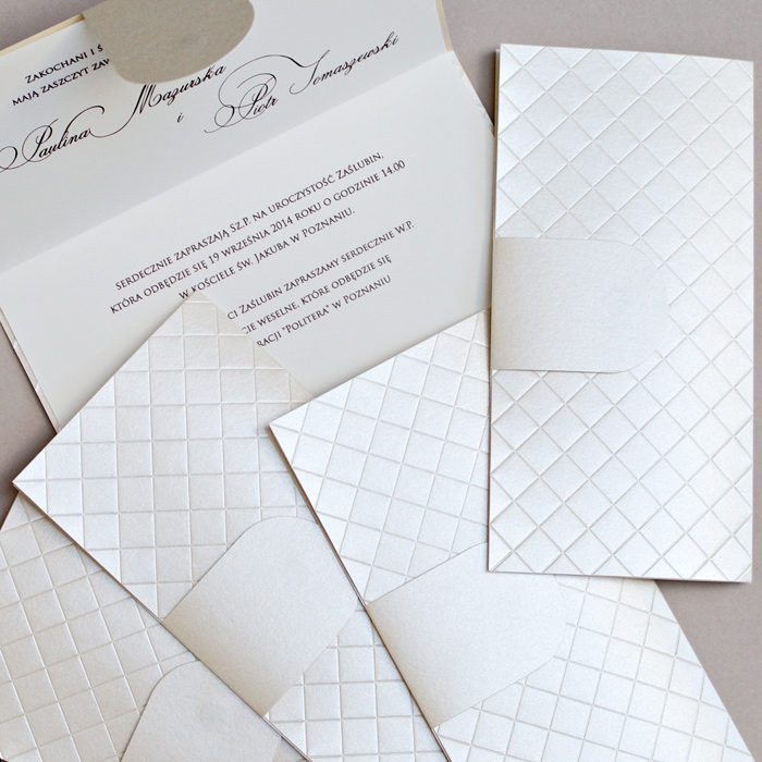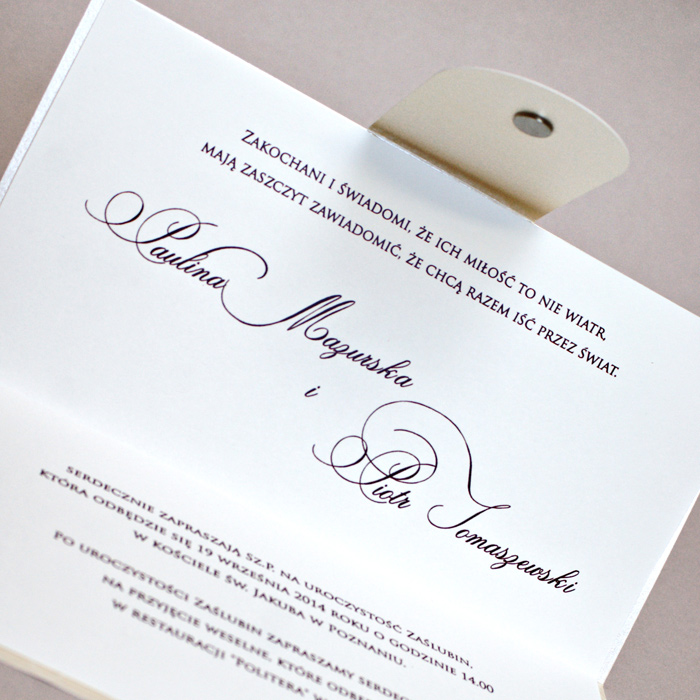 Zaproszenie z najnowszej kolekcji wykonane z perłowego papieru w kolorze ecru. Kształtem przypomina torebkę kopertówkę. Zaproszenie zamykane jest na magnes. Wkładka do nadruku wykonana z matowego papieru w kolorze ecru. Zaproszenie wysyłamy w formie gotowej do wręczenia. Zaproszenie wykonane z ogromną starannością i dbałością o detale. Precyzyjny nadruk, dokładność wykonania oraz wysokiej jakości papier. Do zaproszenia dodana jest ozdobna koperta GRATIS.