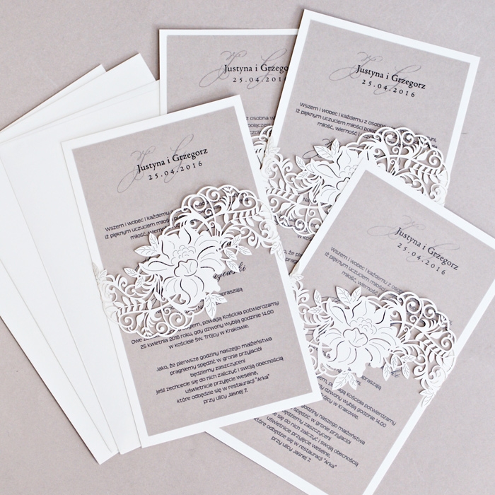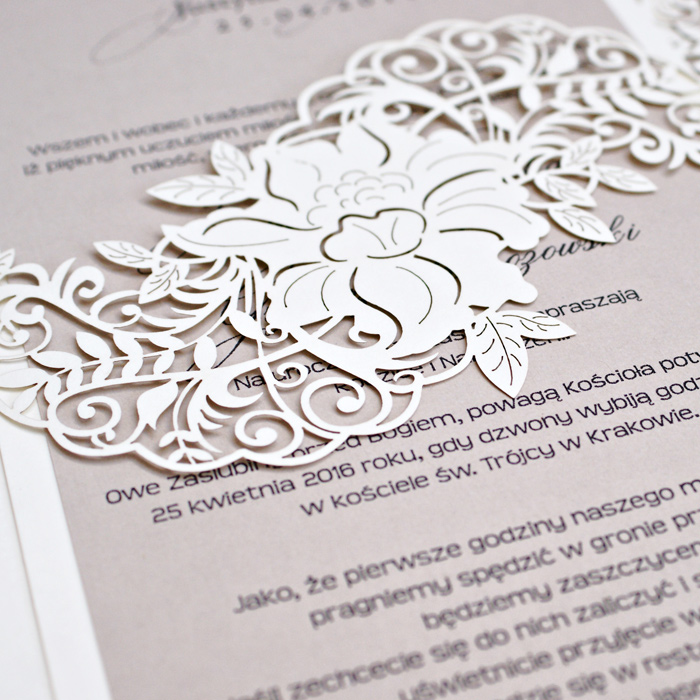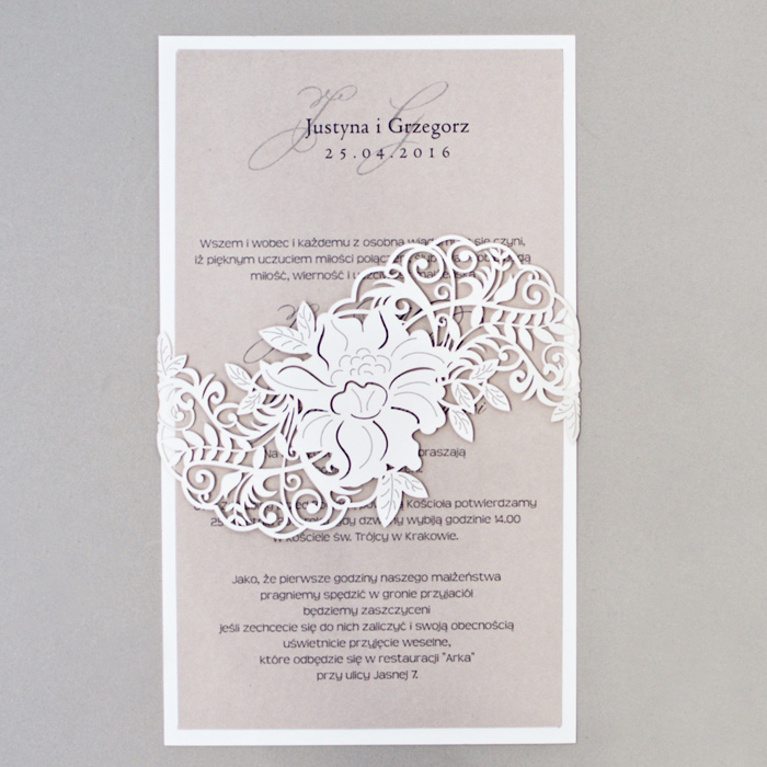 Zaproszenie wykonane z papieru w kolorze białym. Okładkę ozdabia oryginalne wycięcie laserowe. Niektóre elementy zaproszenia zostały dodatkowo wytłoczone. Wkładka do nadruku perłowa lodowa. Dodatkową ozdobą jest satynowa wstążka w kolorze białym. Zaproszenie wysyłamy w formie gotowej do wręczenia. Zaproszenie wykonane z ogromną starannością i dbałością o detale.