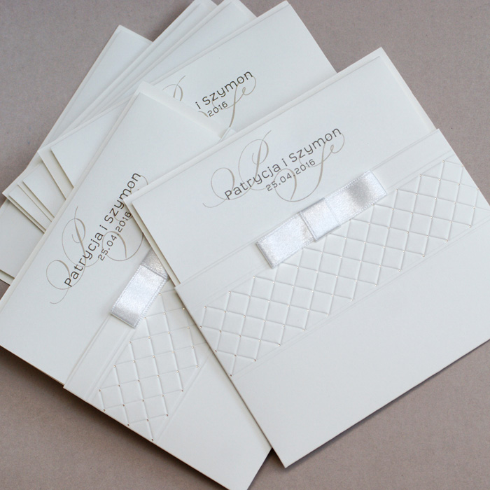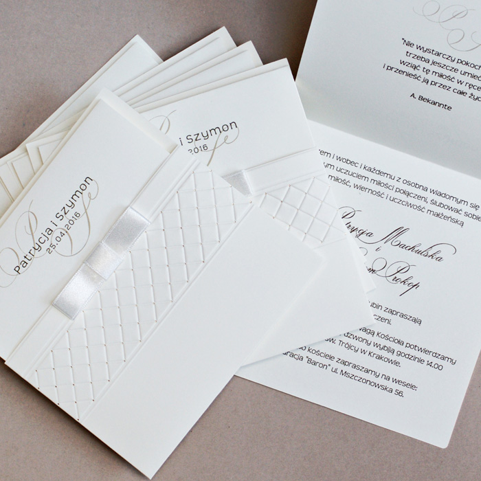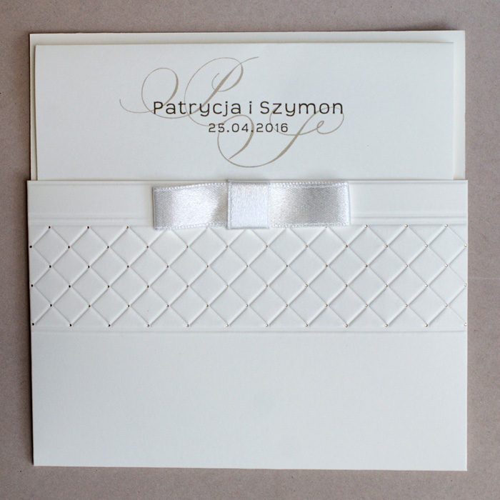 Zaproszenie z najnowszej kolekcji. Okładka w formie kieszonki wykonana z matowego papieru w kolorze ecru, ozdobiona tłoczeniem i delikatnymi złoconymi kropeczkami. Dodatkową ozdobą jest atlasowa wstążka w kolorze ecru. Wkładka do nadruku ecru matowa. Zaproszenie wysyłamy w formie gotowej do wręczenia. Wykonane z ogromną starannością i dbałością o detale. Precyzyjny nadruk, dokładność wykonania oraz wysokiej jakości papier.