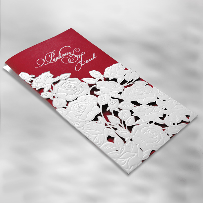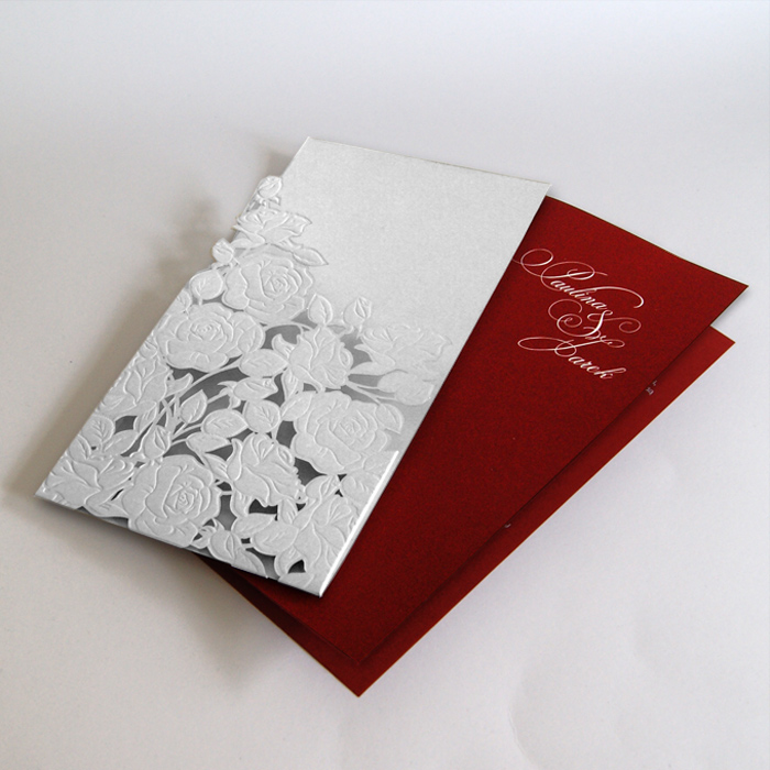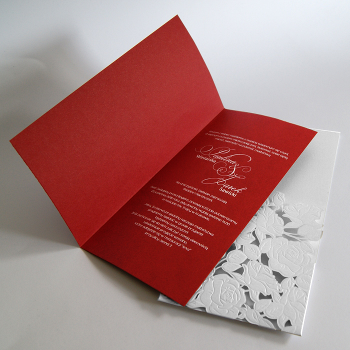 Oryginalne zaproszenie z najnowszej kolekcji. Okładka w kształcie kieszonki wykonana z wysokiej jakości metalizowanego białego papieru. Na okładce znajdują się wytłoczony i wycięty laserowo motyw kwiatowy. Biały nadruk tekstu wykonywany jest na matowej wkładce w kolorze bordowym.