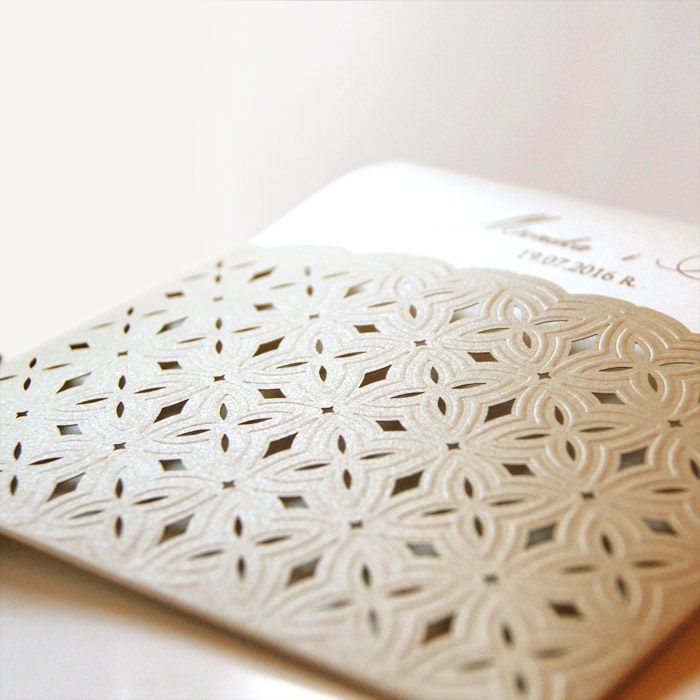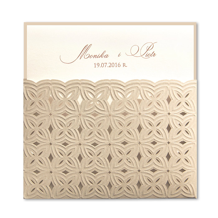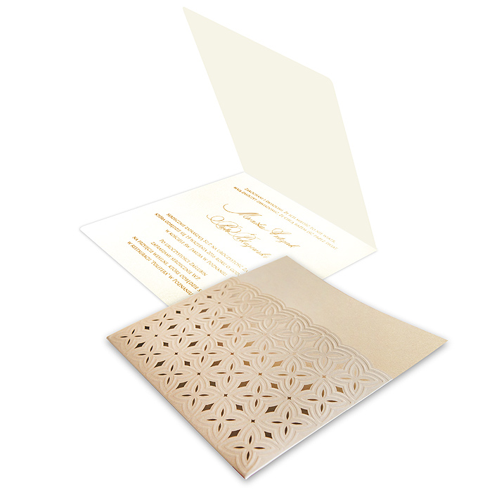 Zaproszenie w formie kieszonki, wykonane z metalizowanego papieru w kolorze beżowym. Okładkę ozdabiają delikatne tłoczenia oraz cięcie laserowe. Wkładka do nadruku tekstu delikatnie połyskująca w odcieniu lodowym. Na pierwszej stronie wkładki drukujemy imiona oraz datę ślubu. Zaproszenie wysyłamy w formie gotowej do wręczenia. Zaproszenie wykonane z ogromną starannością i dbałością o detale. Precyzyjny nadruk, dokładność wykonania oraz wysokiej jakości papier.