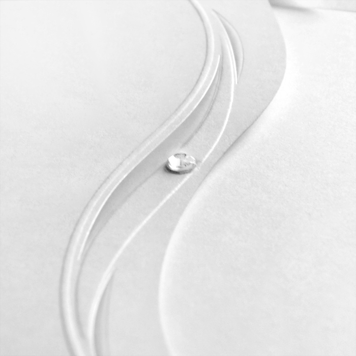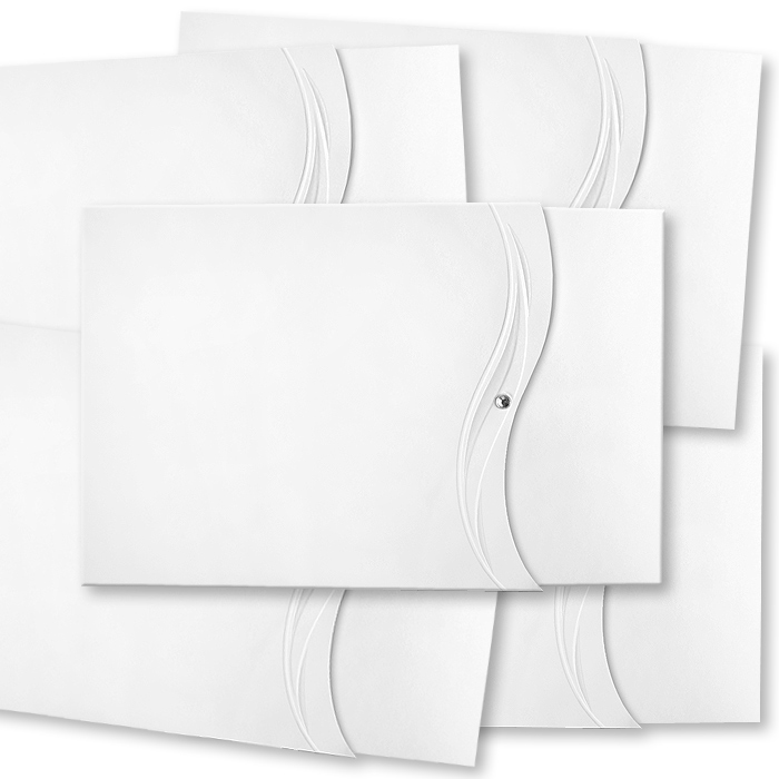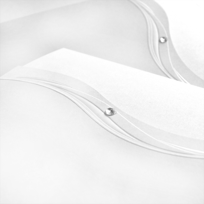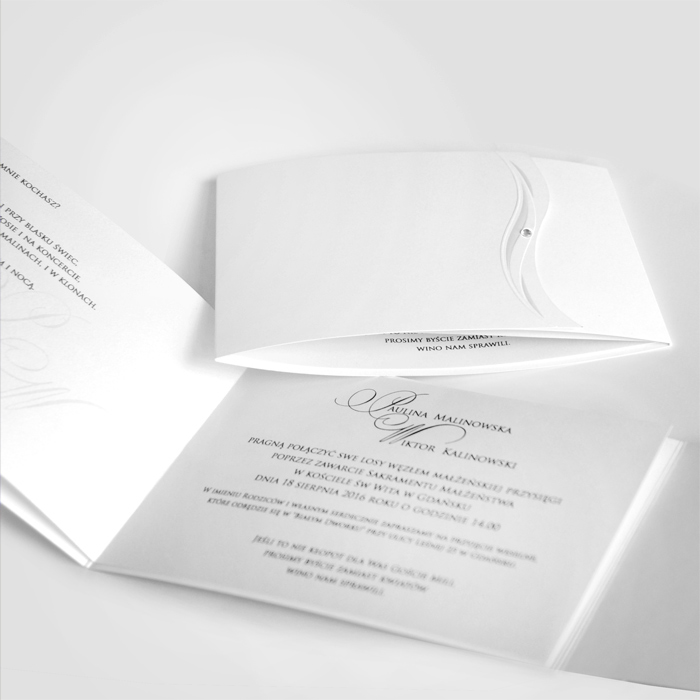 Klasyczne zaproszenie, wykonane z wysokiej jakości matowego papieru w kolorze białym. Okładkę ozdabia subtelny motyw falki wykonany techniką tłoczenia oraz hotstampingu w kolorze perłowym. Dodatkową ozdoba zaproszenia jest kryształek umieszczony w centralnej części falki. Wkładka do nadruku tekstu perłowa w kolorze białym. Zaproszenie wysyłamy w formie gotowej do wręczenia. Zaproszenie wykonane z ogromną starannością i dbałością o detale. Precyzyjny nadruk, dokładność wykonania oraz wysokiej jakości papier.