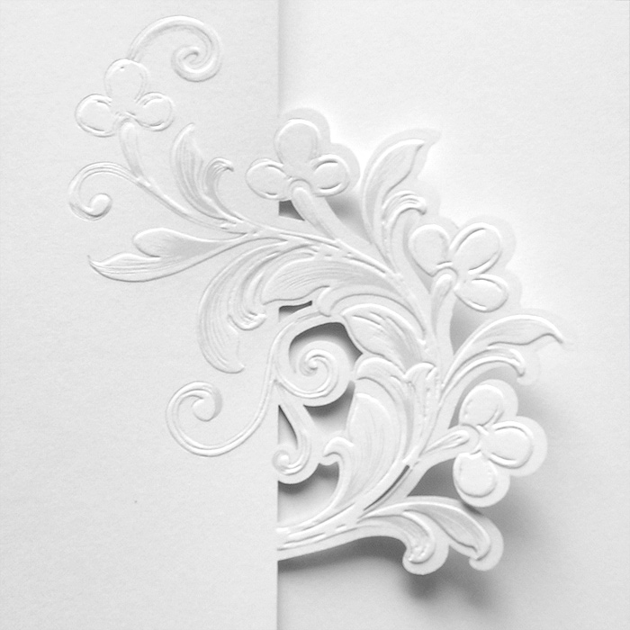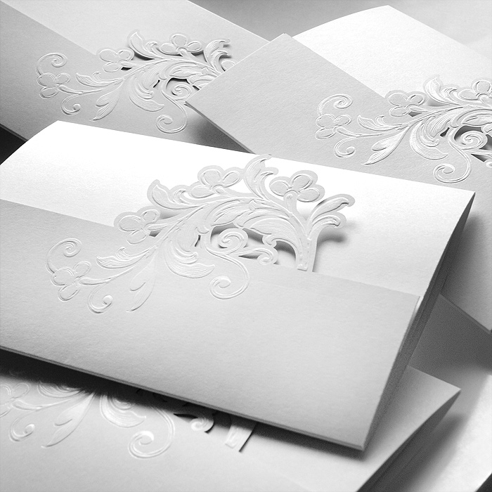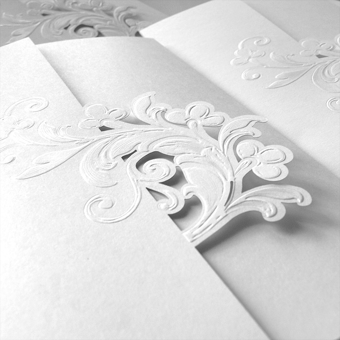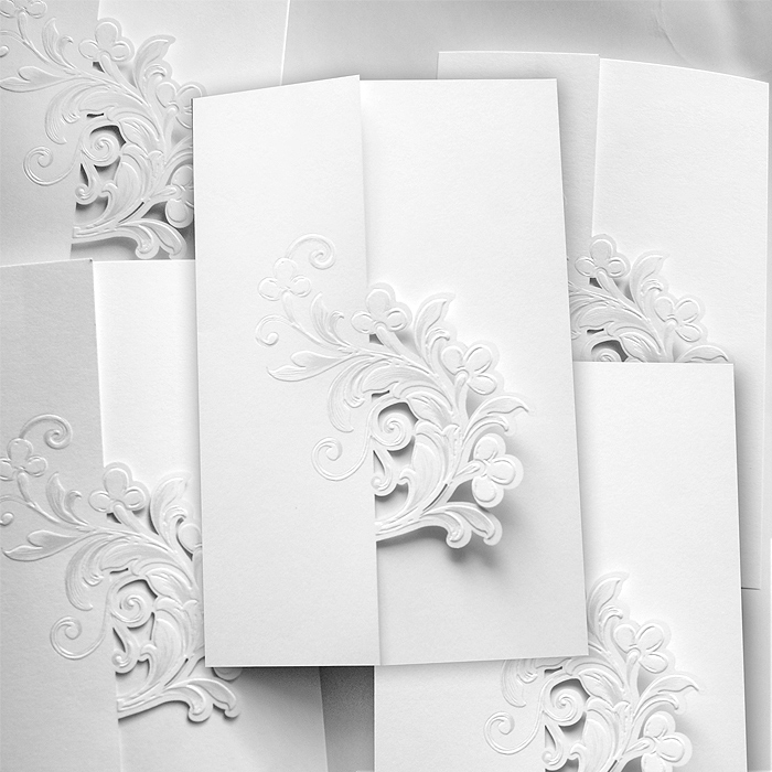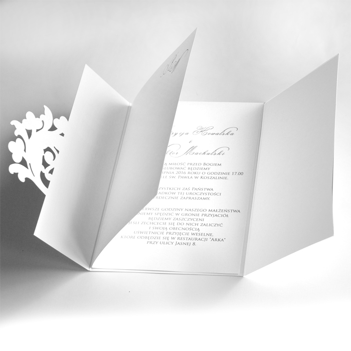 Zaproszenie wykonane z matowego papieru w kolorze białym. Okładkę ozdabia oryginalny motyw kwiatowy wycięty laserowo, dodatkowo ozdobiony perłową folią oraz delikatnym tłoczeniem. Wkładka do nadruku tekstu biała matowa. Zaproszenie wysyłamy w formie gotowej do wręczenia. Zaproszenie wykonane z ogromną starannością i dbałością o detale. Precyzyjny nadruk, dokładność wykonania oraz wysokiej jakości papier.