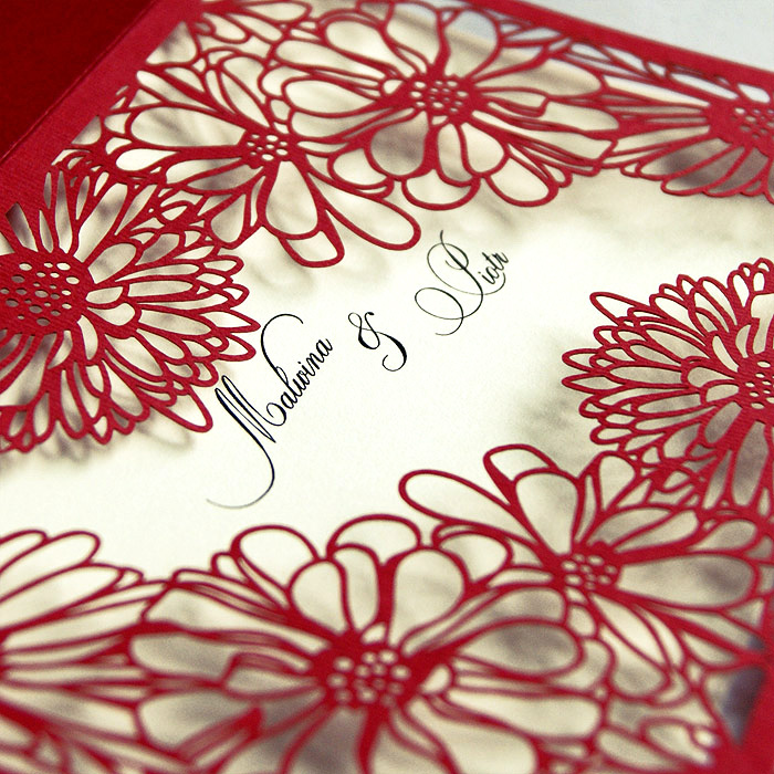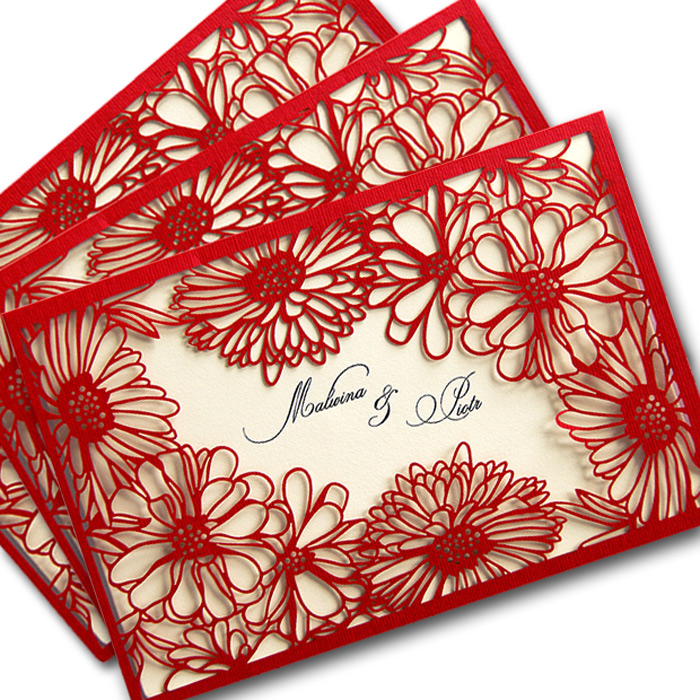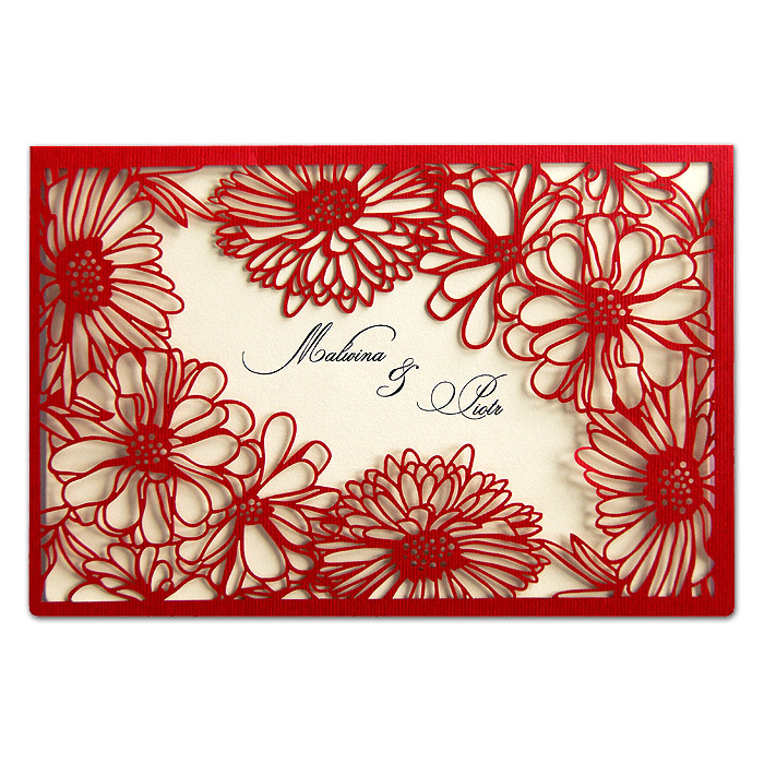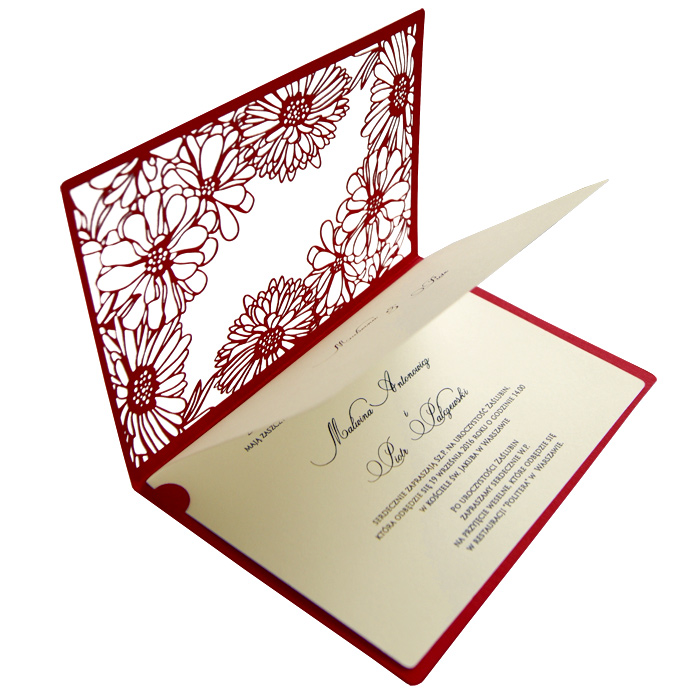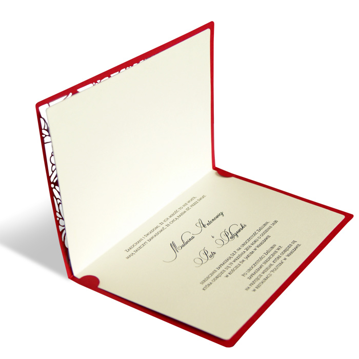Zaproszenie wykonane z matowego papieru w kolorze czerwonym. Okładkę ozdabia oryginalne wycięcie laserowe. Wkładka do nadruku tekstu ecru matowa. W centralnej części miejsce na wydrukowanie imion Młodej Pary. Zaproszenie wysyłamy w formie gotowej do wręczenia. Zaproszenie wykonane z ogromną starannością i dbałością o detale. Precyzyjny nadruk, dokładność wykonania oraz wysokiej jakości papier.