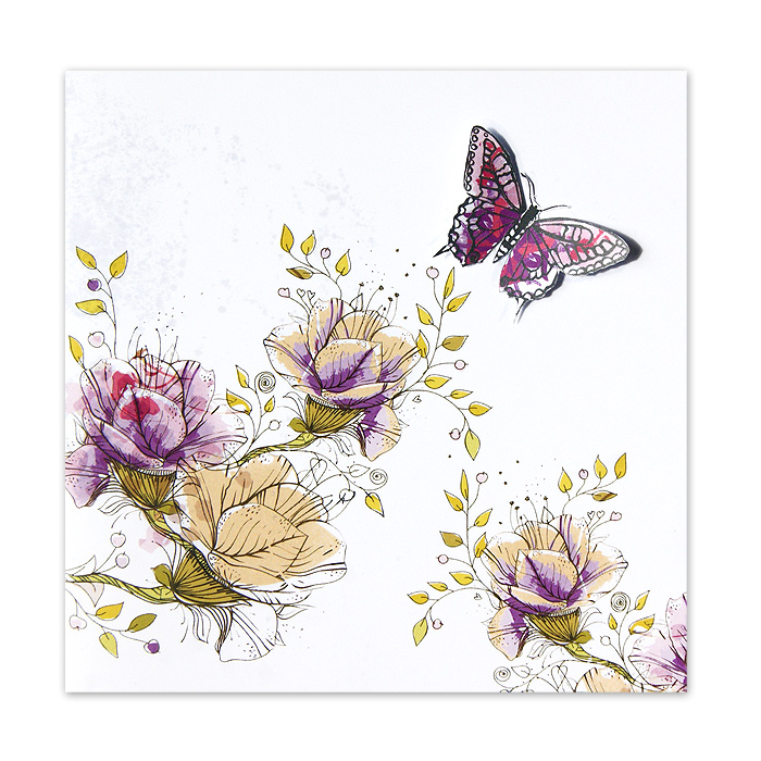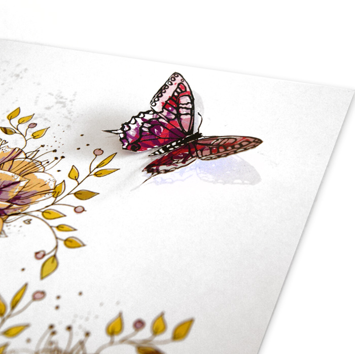 Oryginalne zaproszenie wykonane z białego gładkiego papieru. Na okładce znajdują się nadrukowane kolorowe kwiaty oraz aplikacja w postaci motyla. Wkładka do nadruku biała matowa. Zaproszenie wysyłamy w formie gotowej do wręczenia. Wykonane z ogromną starannością i dbałością o detale. Precyzyjny nadruk, dokładność wykonania oraz wysokiej jakości papier.