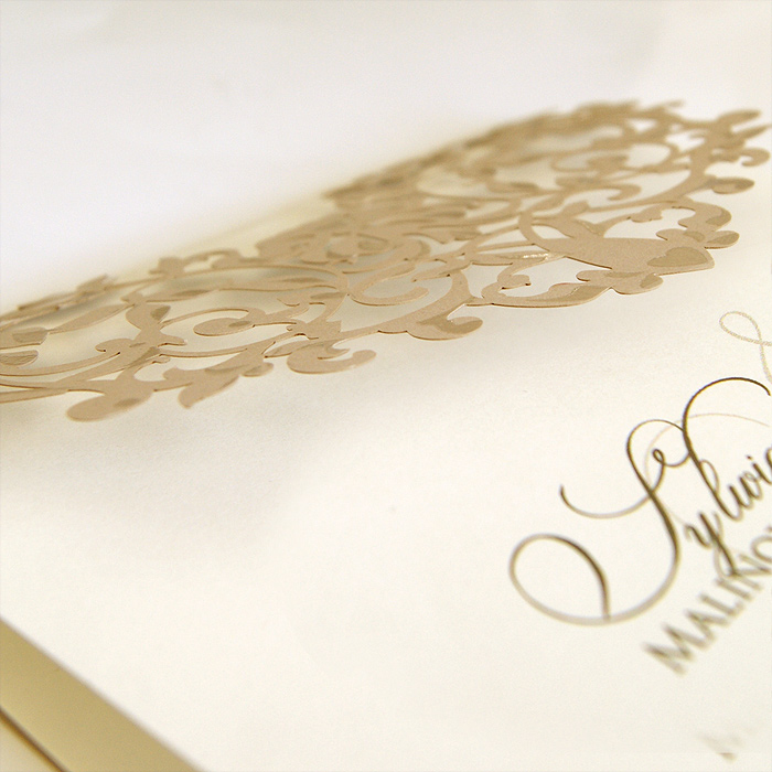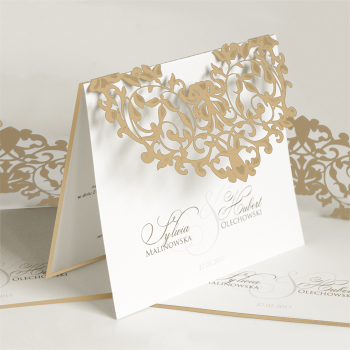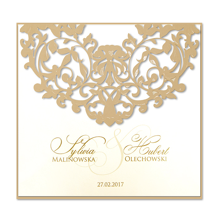 Zaproszenie wykonane z wysokiej jakości matowego papieru w kolorze beżowym. Okładkę ozdabia oryginalne wycięcie laserowe, które zostało dodatkowo ozdobione lakierem UV. Wkładka do nadruku tekstu ecru matowa. Na pierwszej stronie wkładki miejsce na nadruk imion Młodej Pary oraz daty ślubu. Zaproszenie wysyłamy w formie gotowej do wręczenia. Zaproszenie wykonane z ogromną starannością i dbałością o detale. Precyzyjny nadruk, dokładność wykonania oraz wysokiej jakości papier.